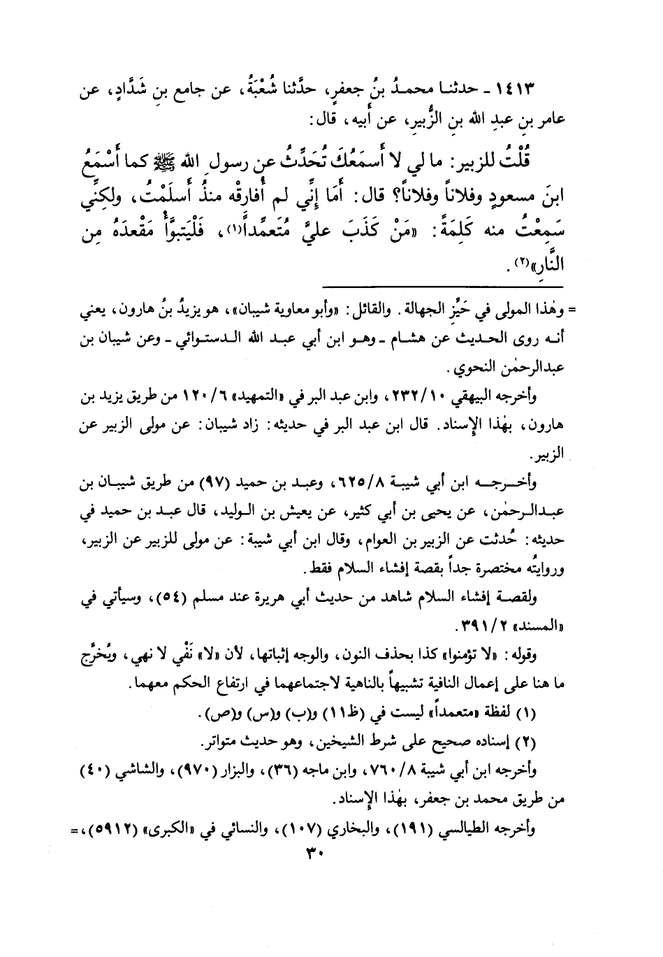 ١٤١٣ - حَدَّثَنَا مُحَمَّدُ بْنُ جَعْفَرٍ، حَدَّثَنَا شُعْبَةُ، عَنْ جَامِعِ بْنِ شَدَّادٍ، عَنْ عَامِرِ بْنِ عَبْدِ اللهِ بْنِ الزُّبَيْرِ، عَنْ أَبِيهِ، قَالَ: قُلْتُ لِلزُّبَيْرِ: مَا لِي لَا أَسْمَعُكَ تُحَدِّثُ عَنْ رَسُولِ اللهِ صَلَّى اللهُ عَلَيْهِ وَسَلَّمَ، كَمَا أَسْمَعُ ابْنَ مَسْعُودٍ، وَفُلانًا، وَفُلانًا؟ قَالَ: أَمَا إِنِّي لَمْ أُفَارِقْهُ مُنْذُ أَسْلَمْتُ، وَلَكِنِّي سَمِعْتُ مِنْهُ كَلِمَةً: " مَنْ كَذَبَ عَلَيَّ مُتَعَمِّدًا (١) فَلْيَتَبَوَّأْ مَقْعَدَهُ مِنَ النَّارِ " (٢)