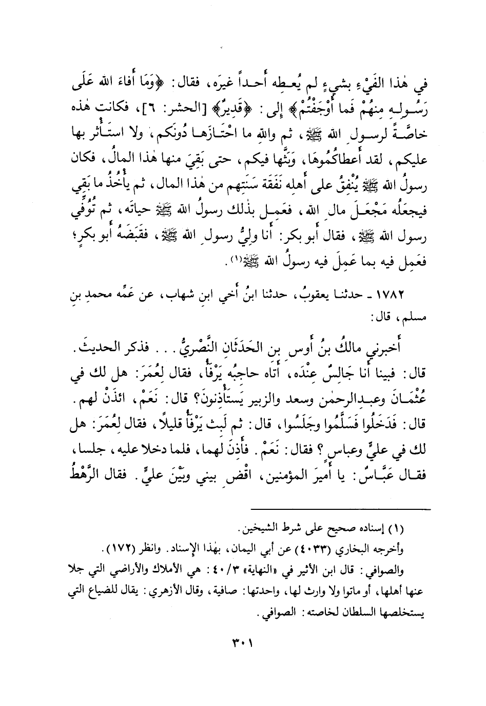 ١٧٨٢ - حَدَّثَنَا يَعْقُوبُ، حَدَّثَنَا ابْنُ أَخِي ابْنِ شِهَابٍ، عَنْ عَمِّهِ مُحَمَّدِ بْنِ مُسْلِمٍ، قَالَ: أَخْبَرَنِي مَالِكُ بْنُ أَوْسِ بْنِ الْحَدَثَانِ النَّصْرِيُّ - فَذَكَرَ الْحَدِيثَ - قَالَ: فَبَيْنَا أَنَا جَالِسٌ، عِنْدَهُ أَتَاهُ حَاجِبُهُ يَرْفَأُ، فَقَالَ لِعُمَرَ: هَلْ لَكَ فِي عُثْمَانَ، وَعَبْدِ الرَّحْمَنِ، وَسَعْدٍ، وَالزُّبَيْرِ يَسْتَأْذِنُونَ؟ قَالَ: نَعَمْ، ائْذَنْ لَهُمْ، قَالَ: فَدَخَلُوا، فَسَلَّمُوا وَجَلَسُوا، قَالَ: ثُمَّ لَبِثَ يَرْفَأُ قَلِيلًا، فَقَالَ لِعُمَرَ: هَلْ لَكَ فِي عَلِيٍّ، وَعَبَّاسٍ؟ فَقَالَ: نَعَمْ، فَأَذِنَ لَهُمَا، فَلَمَّا دَخَلا عَلَيْهِ جَلَسَا، فَقَالَ عَبَّاسٌ: يَا أَمِيرَ الْمُؤْمِنِينَ، اقْضِ بَيْنِي وَبَيْنَ عَلِيٍّ، فَقَالَ الرَّهْطُ