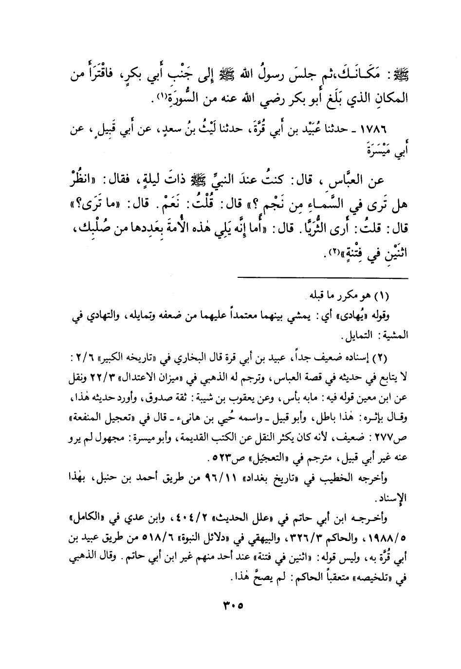 ١٧٨٦ - حَدَّثَنَا عُبَيْدُ بْنُ أَبِي قُرَّةَ، حَدَّثَنَا لَيْثُ بْنُ سَعْدٍ، عَنْ أَبِي قَبِيلٍ، عَنْ أَبِي مَيْسَرَةَ، عَنِ الْعَبَّاسِ، قَالَ: كُنْتُ عِنْدَ النَّبِيِّ صَلَّى اللهُ عَلَيْهِ وَسَلَّمَ ذَاتَ لَيْلَةٍ، فَقَالَ: " انْظُرْ هَلْ تَرَى فِي السَّمَاءِ مِنْ نَجْمٍ؟ " قَالَ: قُلْتُ: نَعَمْ، قَالَ: " مَا تَرَى؟ " قَالَ: قُلْتُ: أَرَى الثُّرَيَّا، قَالَ: " أَمَا إِنَّهُ يَلِي هَذِهِ الْأُمَّةَ بِعَدَدِهَا مِنْ صُلْبِكَ اثْنَيْنِ فِي فِتْنَةٍ " (٢)