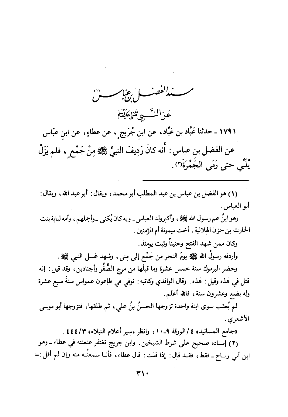 ١٧٩١ - حَدَّثَنَا عَبَّادُ بْنُ عَبَّادٍ، عَنِ ابْنِ جُرَيْجٍ، عَنْ عَطَاءٍ، عَنِ ابْنِ عَبَّاسٍ، عَنِ الْفَضْلِ بْنِ عَبَّاسٍ، أَنَّهُ " كَانَ رَِدِيفَ النَّبِيِّ صَلَّى اللهُ عَلَيْهِ وَسَلَّمَ مِنْ جَمْعٍ، فَلَمْ يَزَلْ يُلَبِّي حَتَّى رَمَى الْجَمْرَةَ " (٢)