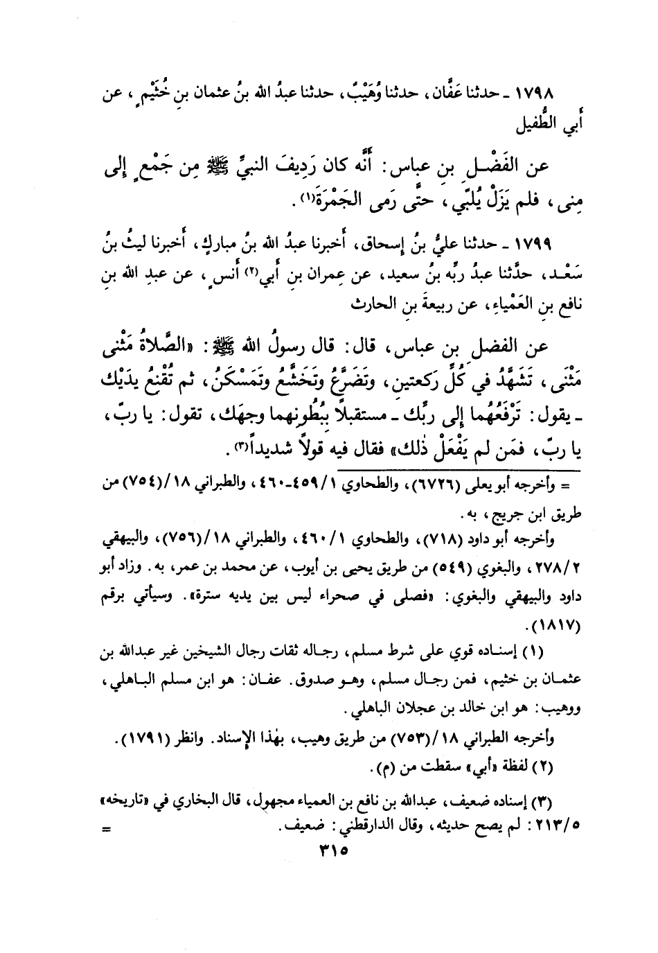 ١٧٩٨ - حَدَّثَنَا عَفَّانُ، حَدَّثَنَا وُهَيْبٌ، حَدَّثَنَا عَبْدُ اللهِ بْنُ عُثْمَانَ بْنِ خُثَيْمٍ، عَنْ أَبِي الطُّفَيْلِ، عَنِ الْفَضْلِ بْنِ عَبَّاسٍ، أَنَّهُ " كَانَ رَدِيفَ النَّبِيِّ صَلَّى اللهُ عَلَيْهِ وَسَلَّمَ مِنْ جَمْعٍ إِلَى مِنًى، فَلَمْ يَزَلْ يُلَبِّي حَتَّى رَمَى الْجَمْرَةَ " (١)