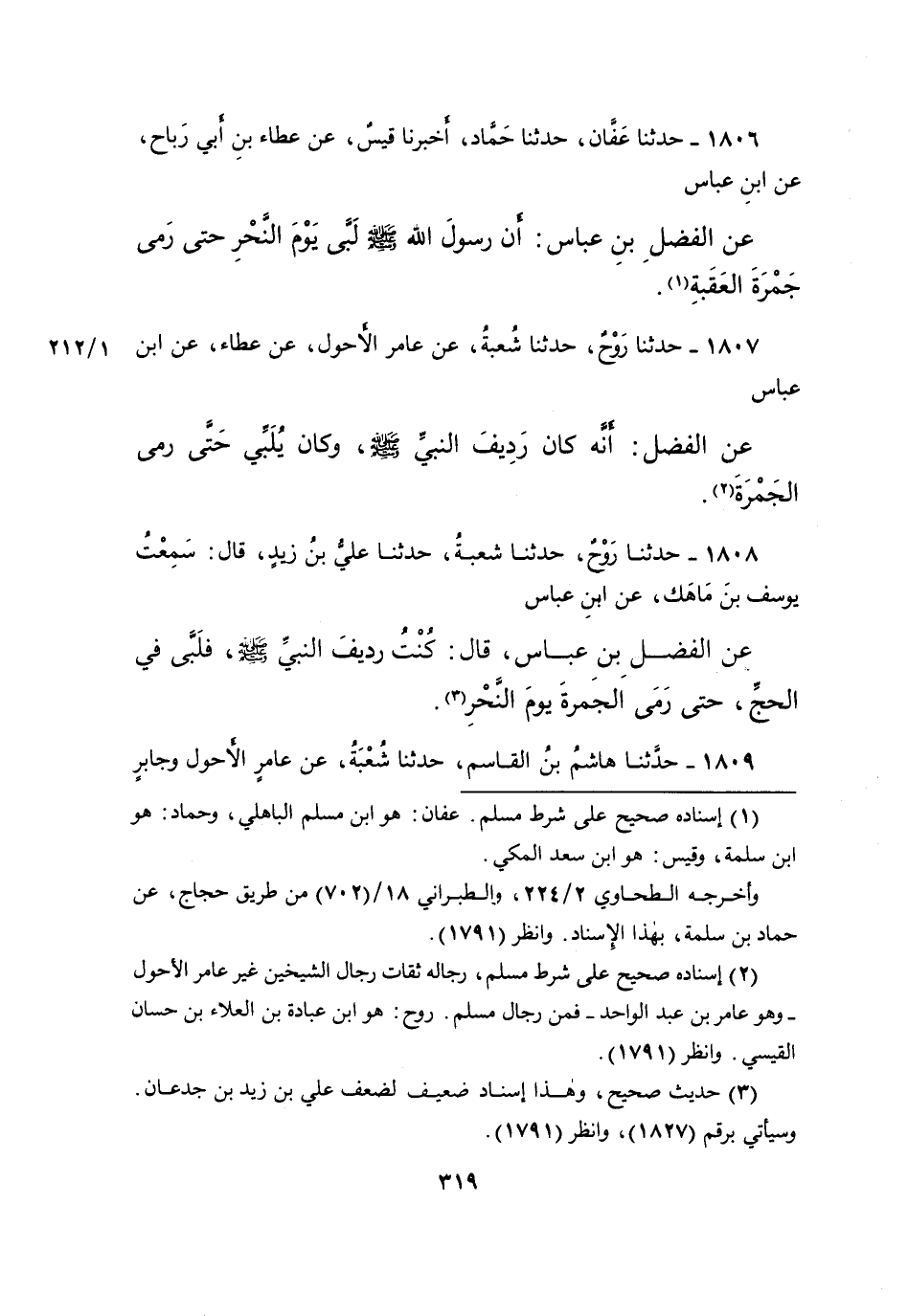 ١٨٠٧ - حَدَّثَنَا رَوْحٌ، حَدَّثَنَا شُعْبَةُ، عَنْ عَامِرٍ الْأَحْوَلِ، عَنْ عَطَاءٍ، عَنِ ابْنِ عَبَّاسٍ، عَنِ الْفَضْلِ، " أَنَّهُ كَانَ رَدِيفَ النَّبِيِّ صَلَّى اللهُ عَلَيْهِ وَسَلَّمَ وَكَانَ يُلَبِّي حَتَّى رَمَى الْجَمْرَةَ " (٢)