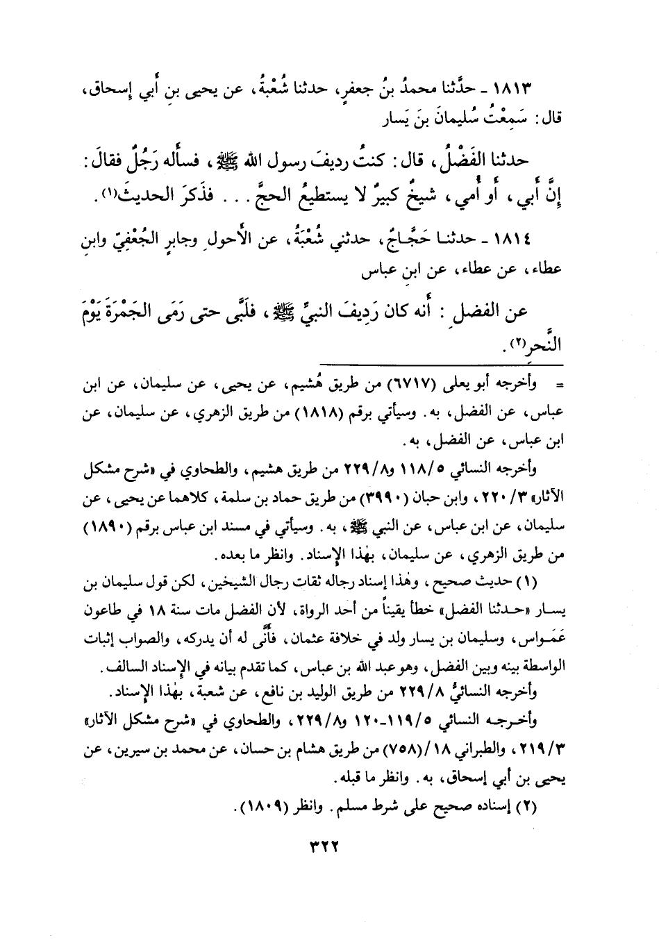 ١٨١٤ - حَدَّثَنَا حَجَّاجٌ، حَدَّثَنِي شُعْبَةُ، عَنِ الْأَحْوَلِ، وَجَابِرٍ الْجُعْفِيِّ، وَابْنِ عَطَاءٍ، عَنْ عَطَاءٍ، عَنِ ابْنِ عَبَّاسٍ، عَنِ الْفَضْلِ، " أَنَّهُ كَانَ رَدِيفَ النَّبِيِّ صَلَّى اللهُ عَلَيْهِ وَسَلَّمَ، فَلَبَّى، حَتَّى رَمَى الْجَمْرَةَ يَوْمَ النَّحْرِ " (٢)