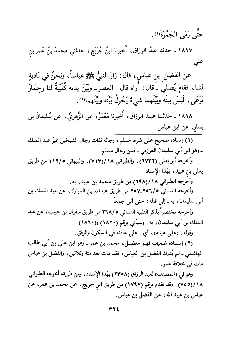 ١٨١٨ - حَدَّثَنَا عَبْدُ الرَّزَّاقِ، أَخْبَرَنَا مَعْمَرٌ، عَنِ الزُّهْرِيِّ، عَنْ سُلَيْمَانَ بْنِ يَسَارٍ، عَنِ ابْنِ عَبَّاسٍ،