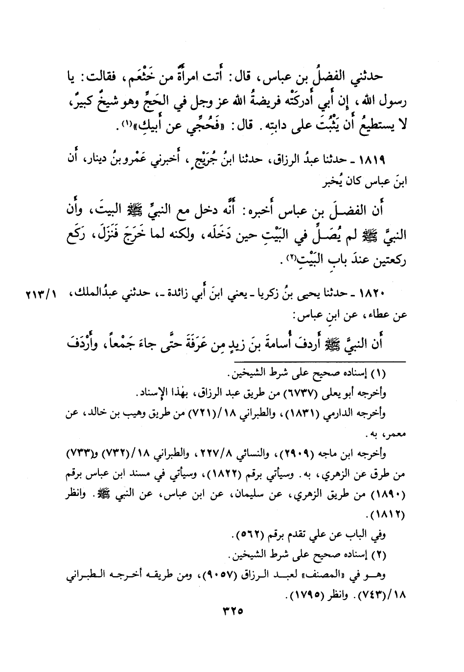 ١٨١٩ - حَدَّثَنَا عَبْدُ الرَّزَّاقِ، حَدَّثَنَا ابْنُ جُرَيْجٍ، أَخْبَرَنِي عَمْرُو بْنُ دِينَارٍ، أَنَّ ابْنَ عَبَّاسٍ، كَانَ يُخْبِرُ أَنَّ الْفَضْلَ بْنَ عَبَّاسٍ، أَخْبَرَهُ: " أَنَّهُ دَخَلَ مَعَ النَّبِيِّ صَلَّى اللهُ عَلَيْهِ وَسَلَّمَ الْبَيْتَ، وَأَنَّ النَّبِيَّ صَلَّى اللهُ عَلَيْهِ وَسَلَّمَ لَمْ يُصَلِّ فِي الْبَيْتِ حِينَ دَخَلَهُ، وَلَكِنَّهُ لَمَّا خَرَجَ فَنَزَلَ رَكَعَ رَكْعَتَيْنِ عِنْدَ بَابِ الْبَيْتِ " (٢)