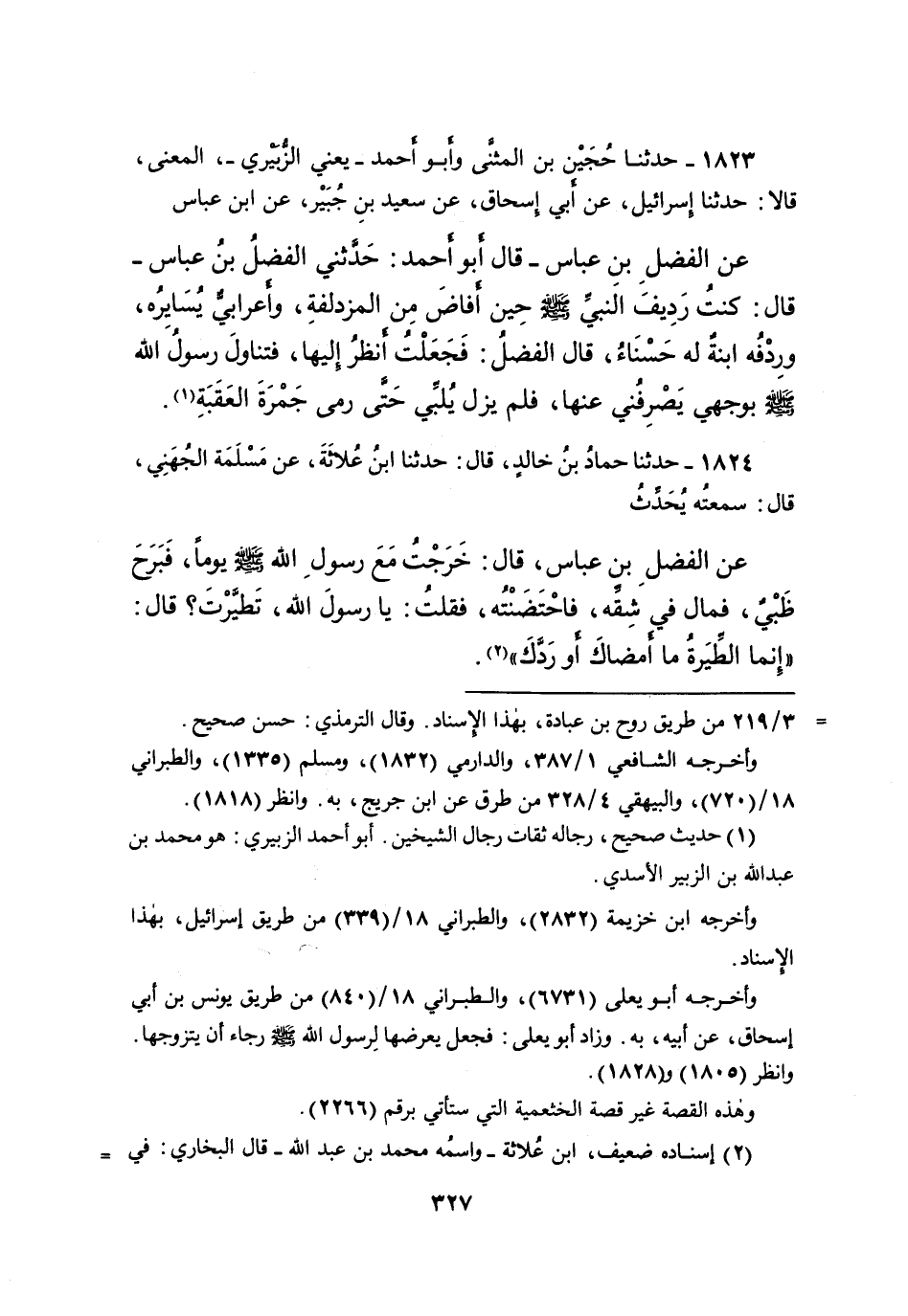 ١٨٢٣ - حَدَّثَنَا حُجَيْنُ بْنُ الْمُثَنَّى، وَأَبُو أَحْمَدَ يَعْنِي الزُّبَيْرِيَّ الْمَعْنَى، قَالا: حَدَّثَنَا إِسْرَائِيلُ، عَنْ أَبِي إِسْحَاقَ، عَنْ سَعِيدِ بْنِ جُبَيْرٍ، عَنِ ابْنِ عَبَّاسٍ، عَنِ الْفَضْلِ بْنِ عَبَّاسٍ، قَالَ أَبُو أَحْمَدَ: حَدَّثَنِي الْفَضْلُ بْنُ عَبَّاسٍ، قَالَ: " كُنْتُ رَدِيفَ النَّبِيِّ صَلَّى اللهُ عَلَيْهِ وَسَلَّمَ، حِينَ أَفَاضَ مِنَ الْمُزْدَلِفَةِ، وَأَعْرَابِيٌّ يُسَايِرُهُ، وَرِدْفُهُ ابْنَةٌ لَهُ حَسْنَاءُ، قَالَ الْفَضْلُ: فَجَعَلْتُ أَنْظُرُ إِلَيْهَا، فَتَنَاوَلَ رَسُولُ اللهِ صَلَّى اللهُ عَلَيْهِ وَسَلَّمَ بِوَجْهِي يَصْرِفُنِي عَنْهَا، فَلَمْ يَزَلْ يُلَبِّي حَتَّى رَمَى جَمْرَةَ الْعَقَبَةِ " (١)