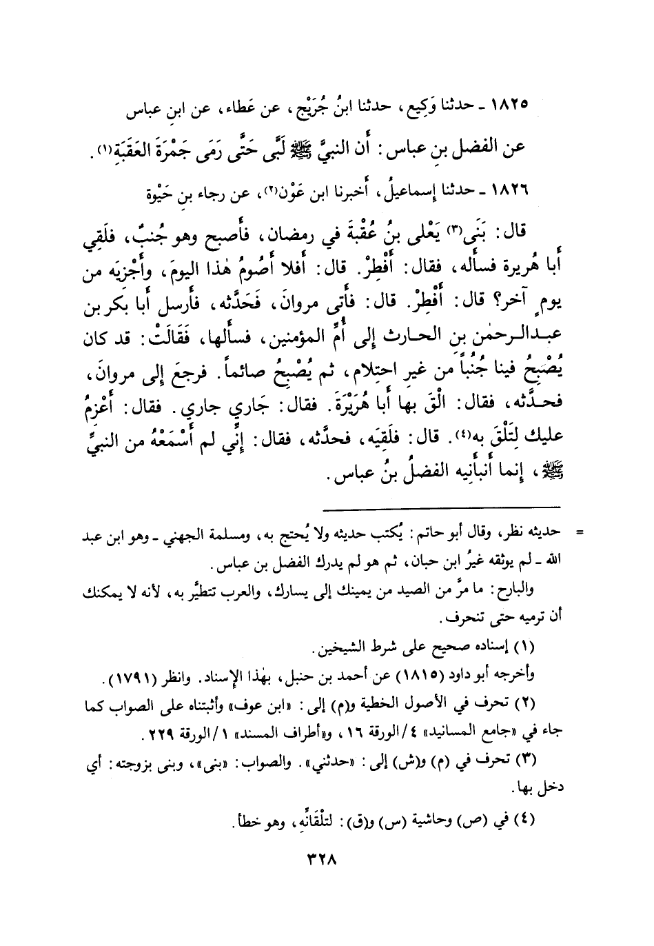 ١٨٢٦ - حَدَّثَنَا إِسْمَاعِيلُ، أَخْبَرَنَا ابْنُ عَوْنٍ (٢) ، عَنْ رَجَاءِ بْنِ حَيْوَةَ، قَالَ: بَنَى (٣) يَعْلَى بْنُ عُقْبَةَ فِي رَمَضَانَ، فَأَصْبَحَ وَهُوَ جُنُبٌ، فَلَقِيَ أَبَا هُرَيْرَةَ فَسَأَلَهُ، فَقَالَ: أَفْطِرْ؟ قَالَ: أَفَلا أَصُومُ هَذَا الْيَوْمَ وَأُجْزِيُهُ مِنْ يَوْمٍ آخَرَ؟ قَالَ: أَفْطِرْ، فَأَتَى مَرْوَانَ فَحَدَّثَهُ، فَأَرْسَلَ أَبَا بَكْرِ بْنَ عَبْدِ الرَّحْمَنِ بْنِ الْحَارِثِ إِلَى أُمِّ الْمُؤْمِنِينَ فَسَأَلَهَا، فَقَالَتْ: " قَدْ كَانَ يُصْبِحُ فِينَا جُنُبًا، مِنْ غَيْرِ احْتِلامٍ، ثُمَّ يُصْبِحُ صَائِمًا " فَرَجَعَ إِلَى مَرْوَانَ فَحَدَّثَهُ، فَقَالَ: الْقَ بِهَا أَبَا هُرَيْرَةَ، فَقَالَ: جَارٌ جَارٌ، فَقَالَ: أَعْزِمُ عَلَيْكَ لَتَلْقَ بِهِ، (٤) قَالَ: فَلَقِيَهُ فَحَدَّثَهُ، فَقَالَ: إِنِّي لَمْ أَسْمَعْهُ مِنَ النَّبِيِّ صَلَّى اللهُ عَلَيْهِ وَسَلَّمَ، إِنَّمَا أَنْبَأَنِيهِ الْفَضْلُ بْنُ عَبَّاسٍ،