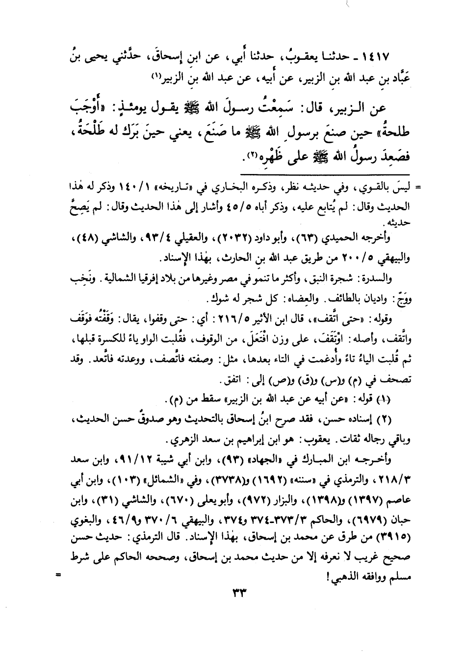 ١٤١٧ - حَدَّثَنَا يَعْقُوبُ، حَدَّثَنَا أَبِي، عَنِ ابْنِ إِسْحَاقَ، حَدَّثَنِي يَحْيَى بْنُ عَبَّادِ بْنِ عَبْدِ اللهِ بْنِ الزُّبَيْرِ، عَنْ أَبِيهِ، عَنْ عَبْدِ اللهِ بْنِ الزُّبَيْرِ (١) ، عَنِ الزُّبَيْرِ، قَالَ: سَمِعْتُ رَسُولَ اللهِ صَلَّى اللهُ عَلَيْهِ وَسَلَّمَ يَقُولُ يَوْمَئِذٍ: " أَوْجَبَ طَلْحَةُ " حِينَ صَنَعَ بِرَسُولِ اللهِ صَلَّى اللهُ عَلَيْهِ وَسَلَّمَ مَا صَنَعَ، يَعْنِي حِينَ بَرَكَ لَهُ طَلْحَةُ فَصَعِدَ رَسُولُ اللهِ صَلَّى اللهُ عَلَيْهِ وَسَلَّمَ عَلَى ظَهْرِهِ (٢)