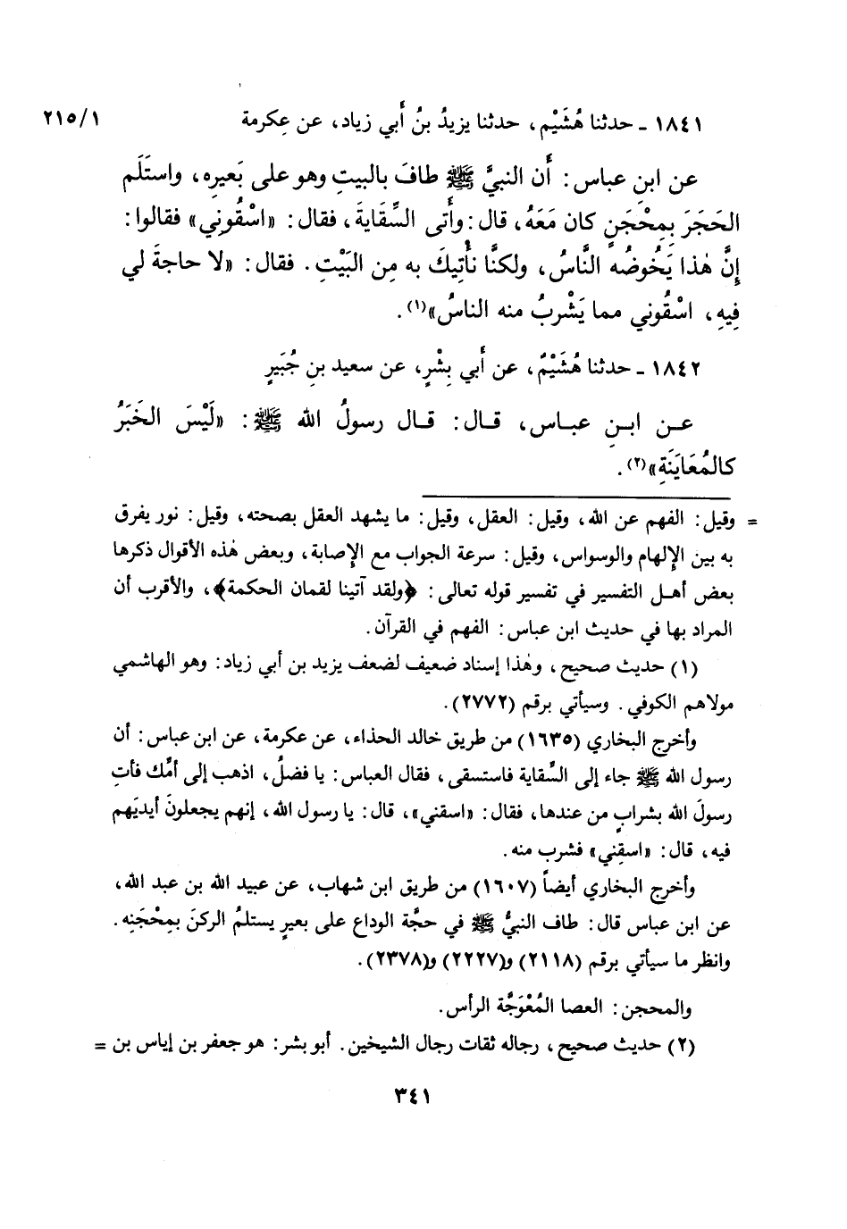 ١٨٤١ - حَدَّثَنَا هُشَيْمٌ، حَدَّثَنَا يَزِيدُ بْنُ أَبِي زِيَادٍ، عَنْ عِكْرِمَةَ، عَنِ ابْنِ عَبَّاسٍ، أَنَّ النَّبِيَّ صَلَّى اللهُ عَلَيْهِ وَسَلَّمَ طَافَ بِالْبَيْتِ وَهُوَ عَلَى بَعِيرِهِ، وَاسْتَلَمَ الْحَجَرَ بِمِحْجَنٍ كَانَ مَعَهُ، قَالَ: وَأَتَى السِّقَايَةَ، فَقَالَ: " اسْقُونِي "، فَقَالُوا: إِنَّ هَذَا يَخُوضُهُ النَّاسُ، وَلَكِنَّا نَأْتِيكَ بِهِ مِنَ البَيْتِ، فَقَالَ: " لَا حَاجَةَ لِي فِيهِ، اسْقُونِي مِمَّا يَشْرَبُ مِنْهُ النَّاسُ " (١)