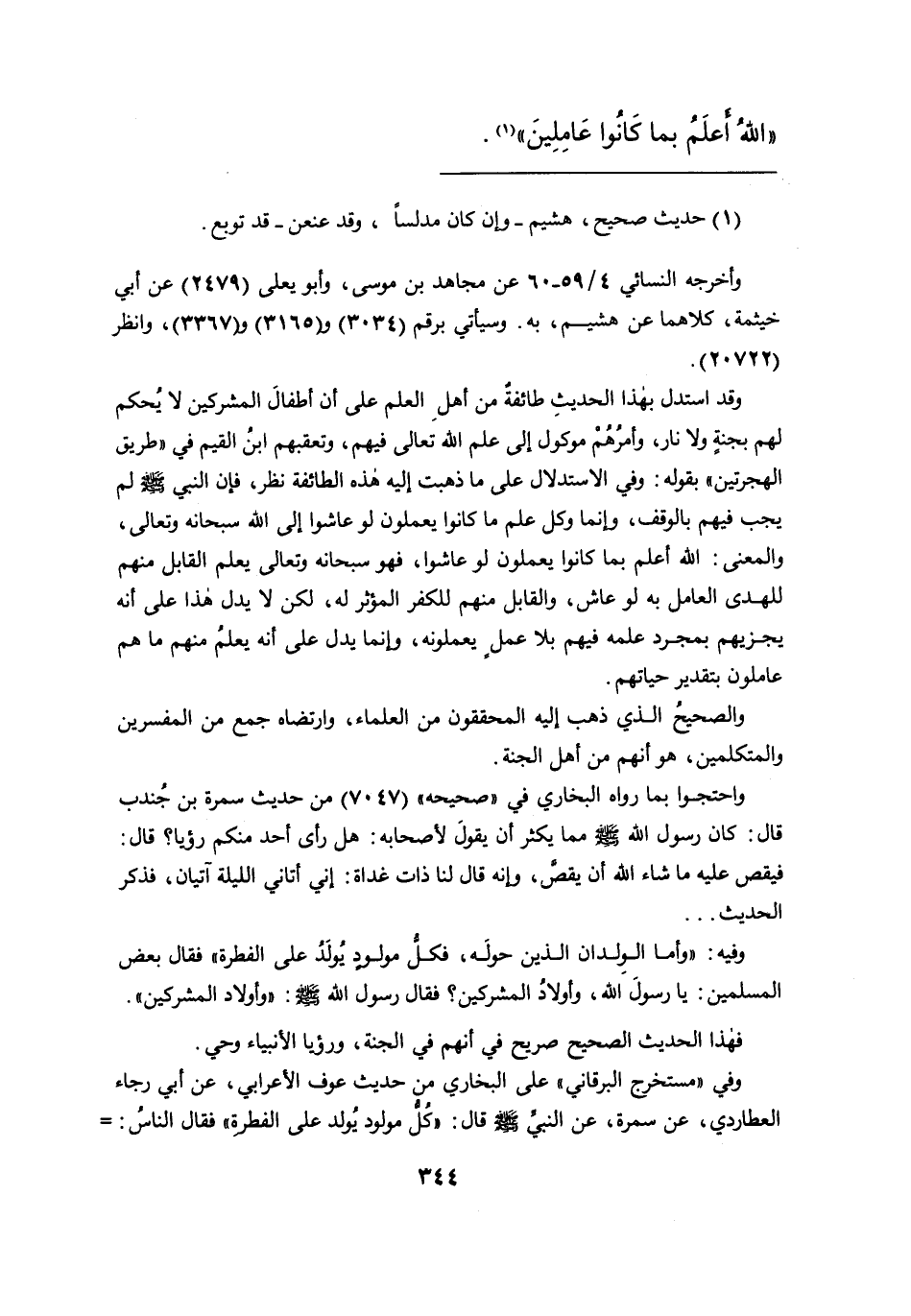 وقد استدل بهذا الحديثِ طائفة من أهلِ العلم على أن أطفالَ المشركين لا يُحكم لهم بجنةٍ ولا نار، وأمرُهُمْ موكول إلى علم الله تعالى فيهم، وتعقبهم ابن القيم في "طريق الهجرتين" بقوله: وفي الاستدلال على ما ذهبت إليه هذه الطائفة نظر، فإن النبي صَلَّى اللهُ عَلَيْهِ وَسَلَّمَ لم يجب فيهم بالوقف، وإنما وكل علم ما كانوا يعملون لو عاشوا إلى الله سبحانه وتعالى، والمعنى: الله أعلم بما كانوا يعملون لو عاشوا، فهو سبحانه وتعالى يعلم القابل منهم للهدى العامل به لو عاش، والقابل منهم للكفر المؤثر له، لكن لا يدل هذا على أنه يجزيهم بمجرد علمه فيهم بلا عمل يعملونه، وإنما يدل على أنه يعلمُ منهم ما هم عاملون بتقدير حياتهم.