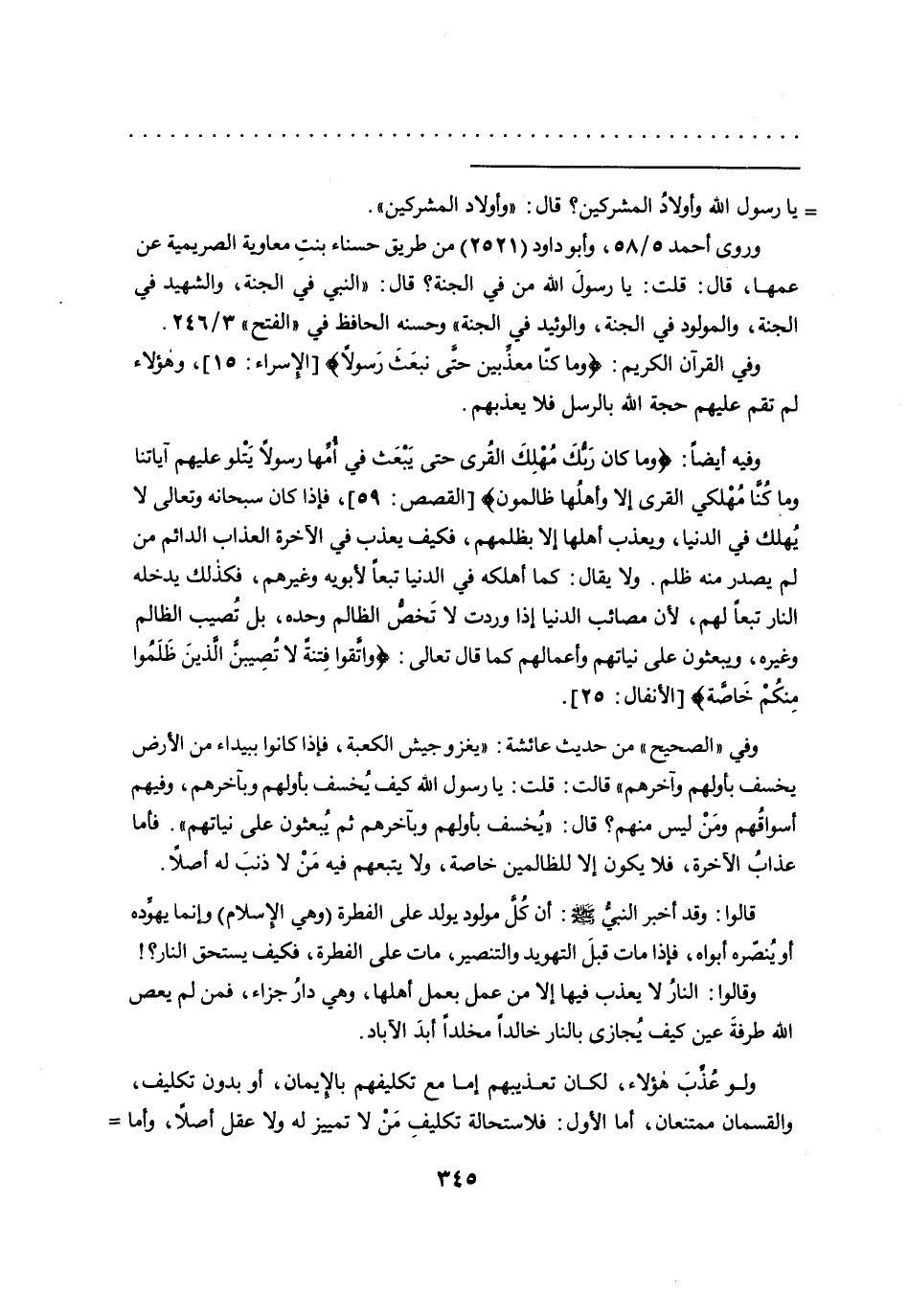 وفيه أيضاً: (وما كان رَبْكَ مُهْلِكَ القُرى حتى يَبْعَث في أمِّها رسولاً يَتْلو عليهم آياتنا وما كُنا مُهْلكي القرى إلا وأهلُها ظالمون) ] القصص: ٥٩ [، فإذا كان سبحانه وتعالى لا يُهلك في الدنيا، ويعذب أهلها إلا بظلمهم، فكيف يعذب في الآخرة العذاب الدائم من لم يصدر منه ظلم. ولا يقال: كما أهلكه في الدنيا تبعاً لأبويه وغيرهم، فكذلك يدخله النار تبعاً لهم، لأن مصائب الدنيا إذا وردت لا تَخص الظالم وحده، بل تُصيب الظالم وغيره، ويبعثون على نياتهم وأعمالهم كما قال تعالى: (واتقوا فِتنةً لا تصِيبن الذينَ ظَلَمُوا مِنكُمْ خَاصة) ] الأنفال: ٢٥ [.