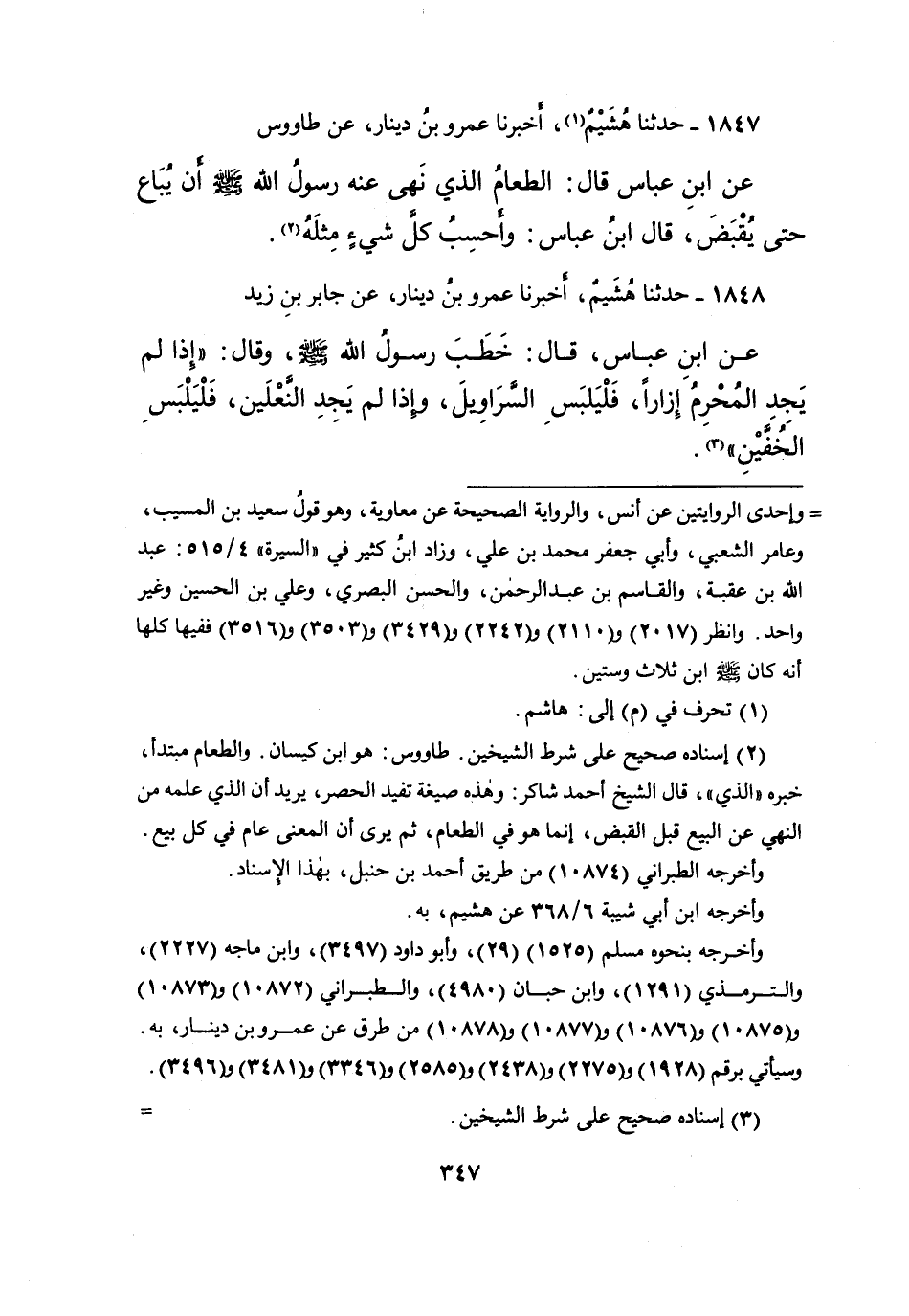 ١٨٤٧ - حَدَّثَنَا هُشَيْمٌ (١) ، أَخْبَرَنَا عَمْرُو بْنُ دِينَارٍ، عَنْ طَاوُسٍ، عَنِ ابْنِ عَبَّاسٍ، قَالَ: " الطَّعَامُ الَّذِي نَهَى عَنْهُ رَسُولُ اللهِ صَلَّى اللهُ عَلَيْهِ وَسَلَّمَ: أَنْ يُبَاعَ حَتَّى يُقْبَضَ " قَالَ ابْنُ عَبَّاسٍ: وَأَحْسَبُ كُلَّ شَيْءٍ مِثْلَهُ (٢)