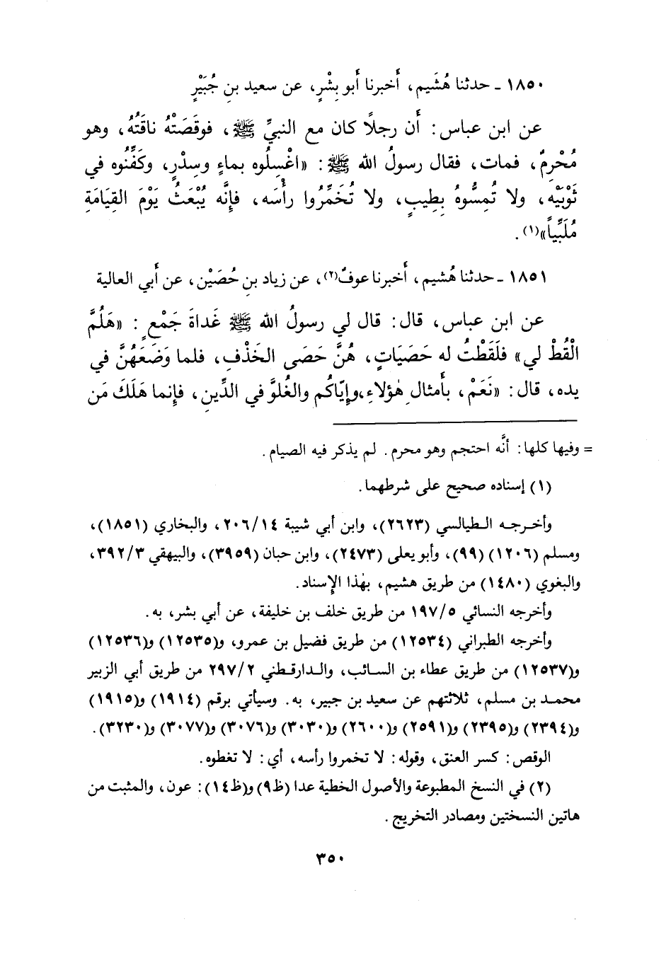 ١٨٥٠ - حَدَّثَنَا هُشَيْمٌ، أَخْبَرَنَا أَبُو بِشْرٍ، عَنْ سَعِيدِ بْنِ جُبَيْرٍ، عَنِ ابْنِ عَبَّاسٍ: أَنَّ رَجُلًا كَانَ مَعَ النَّبِيِّ صَلَّى اللهُ عَلَيْهِ وَسَلَّمَ، فَوَقَصَتْهُ نَاقَتُهُ وَهُوَ مُحْرِمٌ، فَمَاتَ، فَقَالَ رَسُولُ اللهِ صَلَّى اللهُ عَلَيْهِ وَسَلَّمَ: " اغْسِلُوهُ بِمَاءٍ وَسِدْرٍ، وَكَفِّنُوهُ فِي ثَوْبَيْهِ، وَلا تَمَسُّوهُ بِطِيبٍ، وَلا تُخَمِّرُوا رَأْسَهُ، فَإِنَّهُ يُبْعَثُ يَوْمَ الْقِيَامَةِ مُلَبِّيًا " (١)