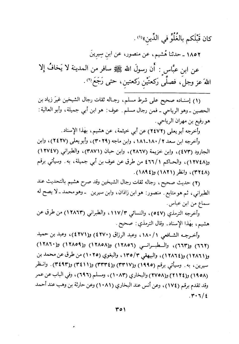 ١٨٥٢ - حَدَّثَنَا هُشَيْمٌ، عَنْ مَنْصُورٍ، عَنِ ابْنِ سِيرِينَ، عَنِ ابْنِ عَبَّاسٍ، " أَنَّ رَسُولَ اللهِ صَلَّى اللهُ عَلَيْهِ وَسَلَّمَ سَافَرَ مِنَ الْمَدِينَةِ لَا يَخَافُ إِلا اللهَ عَزَّ وَجَلَّ، فَصَلَّى رَكْعَتَيْنِ رَكْعَتَيْنِ، حَتَّى رَجَعَ " (٢)
