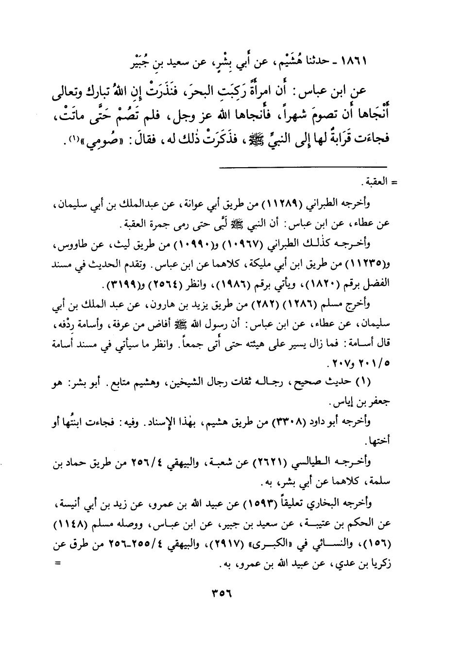 ١٨٦١ - حَدَّثَنَا هُشَيْمٌ، عَنْ أَبِي بِشْرٍ، عَنْ سَعِيدِ بْنِ جُبَيْرٍ، عَنِ ابْنِ عَبَّاسٍ، أَنَّ امْرَأَةً رَكِبَتِ الْبَحْرَ، فَنَذَرَتْ: إِنِ اللهُ تَبَارَكَ وَتَعَالَى أَنْجَاهَا أَنْ تَصُومَ شَهْرًا، فَأَنْجَاهَا اللهُ عَزَّ وَجَلَّ فَلَمْ تَصُمْ حَتَّى مَاتَتْ، فَجَاءَتْ قَرَابَةٌ لَهَا إِلَى النَّبِيِّ صَلَّى اللهُ عَلَيْهِ وَسَلَّمَ، فَذَكَرَتْ ذَلِكَ لَهُ، فَقَالَ: " صُومِي " (١)
