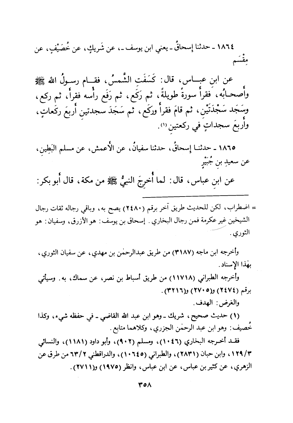 ١٨٦٤ - حَدَّثَنَا إِسْحَاقُ يَعْنِي ابْنَ يُوسُفَ، عَنْ شَرِيكٍ، عَنْ خُصَيْفٍ، عَنْ مِقْسَمٍ، عَنِ ابْنِ عَبَّاسٍ، قَالَ: " كَسَفَتِ الشَّمْسُ، فَقَامَ رَسُولُ اللهِ صَلَّى اللهُ عَلَيْهِ وَسَلَّمَ وَأَصْحَابُهُ، فَقَرَأَ سُورَةً طَوِيلَةً، ثُمَّ رَكَعَ، ثُمَّ رَفَعَ رَأْسَهُ فَقَرَأَ، ثُمَّ رَكَعَ وَسَجَدَ سَجْدَتَيْنِ، ثُمَّ قَامَ فَقَرَأَ وَرَكَعَ، ثُمَّ سَجَدَ سَجْدَتَيْنِ، أَرْبَعَ رَكَعَاتٍ وَأَرْبَعَ سَجَدَاتٍ فِي رَكْعَتَيْنِ " (١)