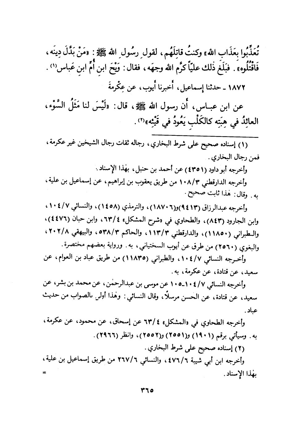 ١٨٧٢ - حَدَّثَنَا إِسْمَاعِيلُ، أَخْبَرَنَا أَيُّوبُ، عَنْ عِكْرِمَةَ، عَنِ ابْنِ عَبَّاسٍ، أَنَّ رَسُولَ اللهِ صَلَّى اللهُ عَلَيْهِ وَسَلَّمَ، قَالَ: " لَيْسَ لَنَا مَثَلُ السُّوءِ: الْعَائِدُ فِي هِبَتِهِ، كَالْكَلْبِ يَعُودُ فِي قَيْئِهِ " (٢)