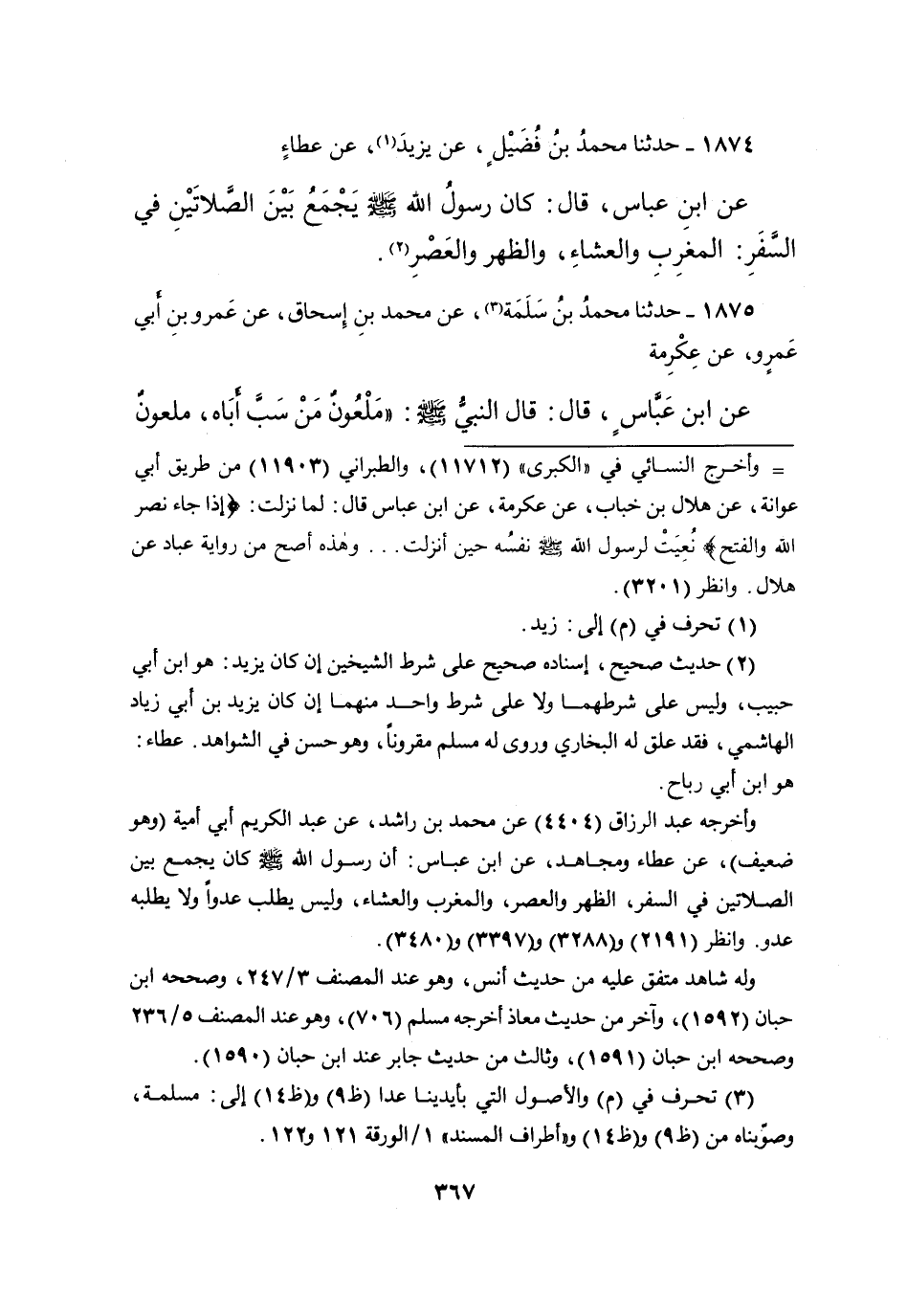 ١٨٧٤ - حَدَّثَنَا مُحَمَّدُ بْنُ فُضَيْلٍ، عَنْ يَزِيدَ (١) ، عَنْ عَطَاءٍ، عَنِ ابْنِ عَبَّاسٍ، قَالَ: " كَانَ رَسُولُ اللهِ صَلَّى اللهُ عَلَيْهِ وَسَلَّمَ يَجْمَعُ بَيْنَ الصَّلاتَيْنِ فِي السَّفَرِ: الْمَغْرِبِ وَالْعِشَاءِ، وَالظُّهْرِ وَالْعَصْرِ " (٢)