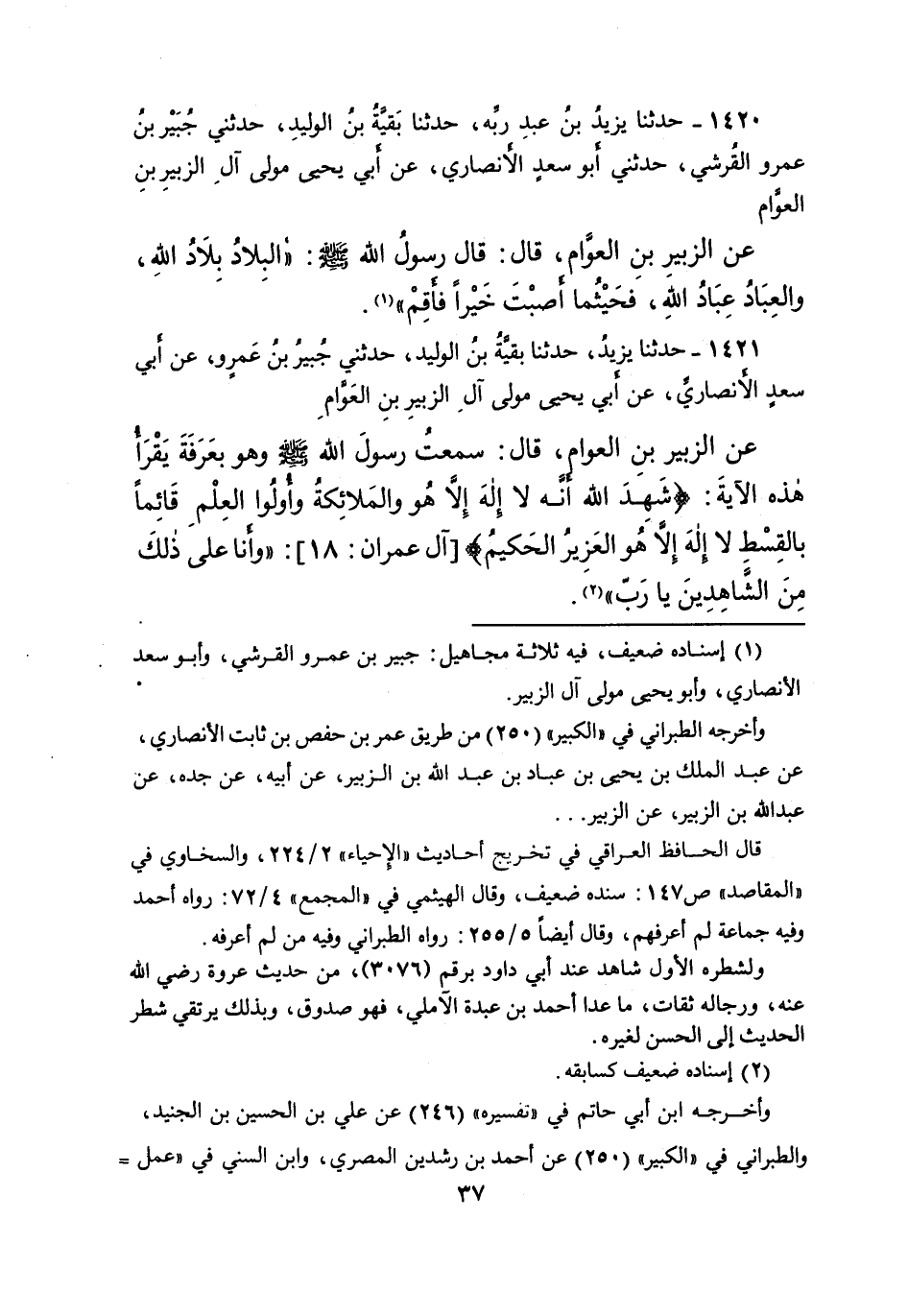 ١٤٢١ - حَدَّثَنَا يَزِيدُ، حَدَّثَنَا بَقِيَّةُ بْنُ الْوَلِيدِ، حَدَّثَنِي جُبَيْرُ بْنُ عَمْرٍو، عَنْ أَبِي سَعْدٍ الْأَنْصَارِيِّ، عَنْ أَبِي يَحْيَى، مَوْلَى آلِ الزُّبَيْرِ بْنِ الْعَوَّامِ، عَنِ الزُّبَيْرِ بْنِ الْعَوَّامِ، قَالَ: " سَمِعْتُ رَسُولَ اللهِ صَلَّى اللهُ عَلَيْهِ وَسَلَّمَ وَهُوَ بِعَرَفَةَ يَقْرَأُ هَذِهِ الْآيَةَ: {شَهِدَ اللهُ أَنَّهُ لَا إِلَهَ إِلا هُوَ وَالْمَلائِكَةُ وَأُولُو الْعِلْمِ قَائِمًا بِالْقِسْطِ لَا إِلَهَ إِلا هُوَ الْعَزِيزُ الْحَكِيمُ} [آل عمران: ١٨] "وَأَنَا عَلَى ذَلِكَ مِنَ الشَّاهِدِينَ يَا رَبِّ " (٢)