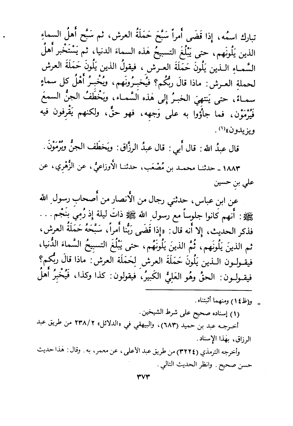 ١٨٨٣ - حَدَّثَنَا مُحَمَّدُ بْنُ مُصْعَبٍ، حَدَّثَنَا الْأَوْزَاعِيُّ، عَنِ الزُّهْرِيِّ، عَنْ عَلِيِّ بْنِ حُسَيْنٍ، عَنِ ابْنِ عَبَّاسٍ، حَدَّثَنِي رِجَالٌ مِنَ الْأَنْصَارِ مِنْ أَصْحَابِ رَسُولِ اللهِ صَلَّى اللهُ عَلَيْهِ وَسَلَّمَ، أَنَّهُمْ كَانُوا جُلُوسًا مَعَ رَسُولِ اللهِ صَلَّى اللهُ عَلَيْهِ وَسَلَّمَ ذَاتَ لَيْلَةٍ، إِذْ رُمِيَ بِنَجْمٍ؛ فَذَكَرَ الْحَدِيثَ إِلا أَنَّهُ قَالَ: " إِذَا قَضَى رَبُّنَا أَمْرًا سَبَّحَهُ حَمَلَةُ الْعَرْشِ، ثُمَّ الَّذِينَ يَلُونَهُمْ، ثُمَّ الَّذِينَ يَلُونَهُمْ حَتَّى يَبْلُغَ التَّسْبِيحُ السَّمَاءَ الدُّنْيَا، فَيَقُولُونَ الَّذِينَ يَلُونَ حَمَلَةَ الْعَرْشِ لِحَمَلَةِ الْعَرْشِ: مَاذَا قَالَ رَبُّكُمْ؟ فَيَقُولُونَ الْحَقَّ، وَهُوَ الْعَلِيُّ الْكَبِيرُ، فَيَقُولُونَ كَذَا وَكَذَا، فَيُخْبِرُ أَهْلُ