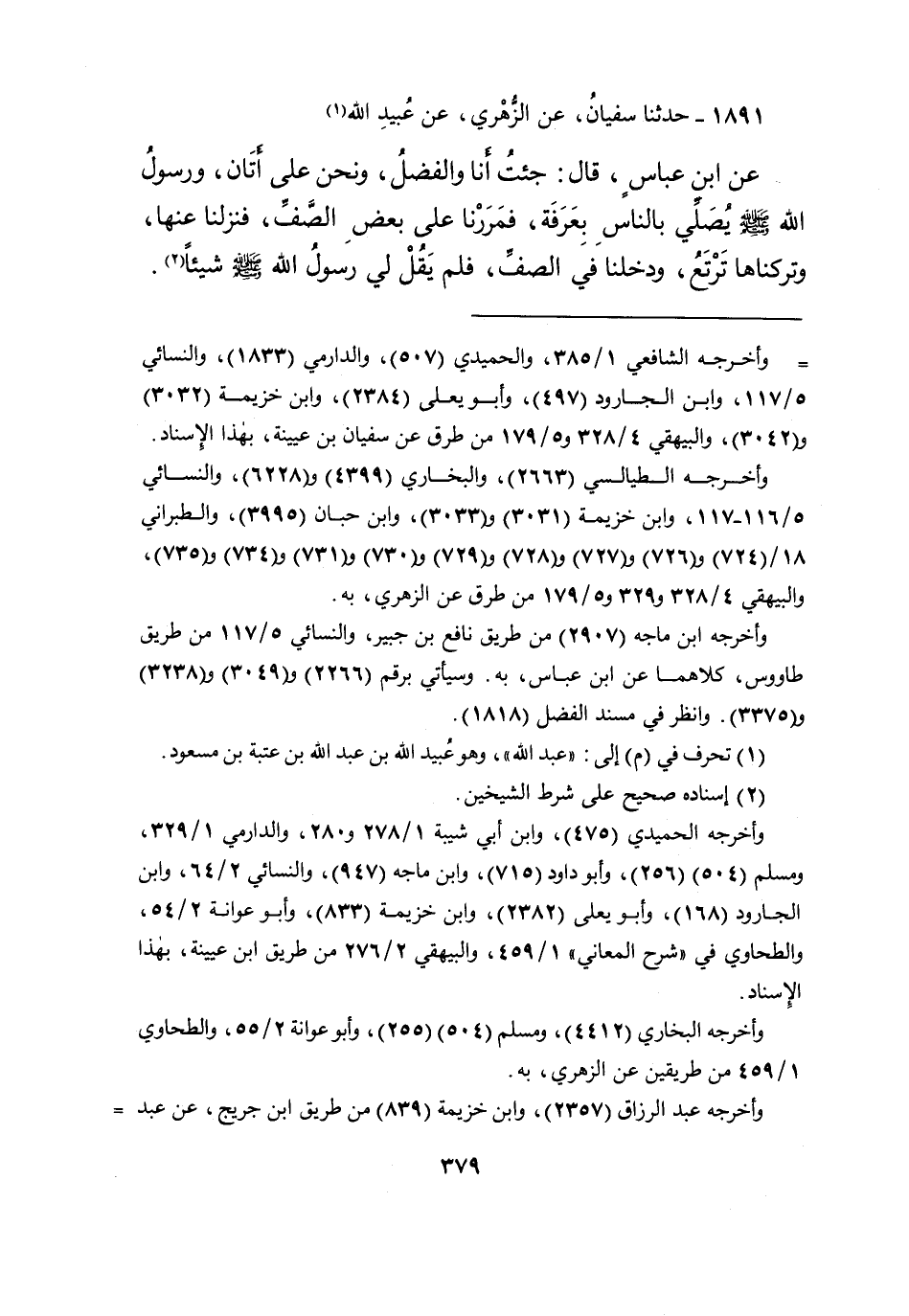 ١٨٩١ - حَدَّثَنَا سُفْيَانُ، عَنِ الزُّهْرِيِّ، عَنْ عُبَيْدِ اللهِ (١) ، عَنِ ابْنِ عَبَّاسٍ، قَالَ: " جِئْتُ أَنَا وَالْفَضْلُ وَنَحْنُ عَلَى أَتَانٍ، وَرَسُولُ اللهِ صَلَّى اللهُ عَلَيْهِ وَسَلَّمَ يُصَلِّي بِالنَّاسِ بِعَرَفَةَ، فَمَرَرْنَا عَلَى بَعْضِ الصَّفِّ، فَنَزَلْنَا عَنْهَا وَتَرَكْنَاهَا تَرْتَعُ، وَدَخَلْنَا فِي الصَّفِّ، فَلَمْ يَقُلْ لِي رَسُولُ اللهِ صَلَّى اللهُ عَلَيْهِ وَسَلَّمَ، شَيْئًا " (٢)