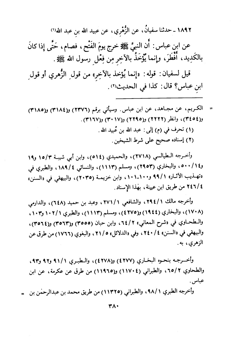 ١٨٩٢ - حَدَّثَنَا سُفْيَانُ، عَنِ الزُّهْرِيِّ، عَنْ عُبَيْدِ اللهِ بْنِ عَبْدِ اللهِ، عَنِ ابْنِ عَبَّاسٍ، " أَنَّ النَّبِيَّ صَلَّى اللهُ عَلَيْهِ وَسَلَّمَ خَرَجَ يَوْمَ الْفَتْحِ، فَصَامَ حَتَّى إِذَا كَانَ بِالْكَدِيدِ أَفْطَرَ "، " وَإِنَّمَا يُؤْخَذُ بِالْآخِرِ مِنْ فِعْلِ رَسُولِ اللهِ صَلَّى اللهُ عَلَيْهِ وَسَلَّمَ " قِيلَ لِسُفْيَانَ: قَوْلُهُ: " إِنَّمَا يُؤْخَذُ بِالْآخِرِ " مِنْ قَوْلِ الزُّهْرِيِّ أَوْ قَوْلِ ابْنِ عَبَّاسٍ؟ قَالَ: كَذَا فِي الْحَدِيثِ (١)