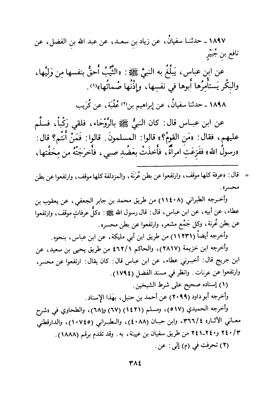 ١٨٩٧ - حَدَّثَنَا سُفْيَانُ، عَنْ زِيَادِ بْنِ سَعْدٍ، عَنْ عَبْدِ اللهِ بْنِ الْفَضْلِ، عَنْ نَافِعِ بْنِ جُبَيْرٍ، عَنِ ابْنِ عَبَّاسٍ يَبْلُغُ بِهِ النَّبِيَّ صَلَّى اللهُ عَلَيْهِ وَسَلَّمَ: " الثَّيِّبُ أَحَقُّ بِنَفْسِهَا مِنْ وَلِيِّهَا، وَالْبِكْرُ يَسْتَأْمِرُهَا أَبُوهَا فِي نَفْسِهَا، وَإِذْنُهَا صُمَاتُهَا " (١)