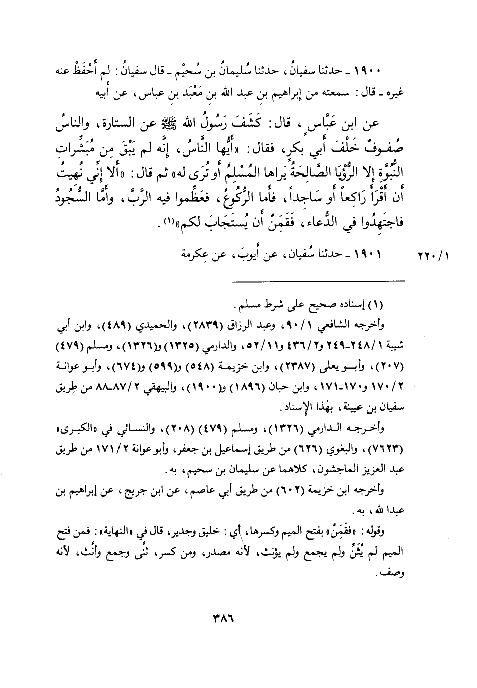 ١٩٠٠ - حَدَّثَنَا سُفْيَانُ، حَدَّثَنَا سُلَيْمَانُ بْنُ سُحَيْمٍ، قَالَ سُفْيَانُ: لَمْ أَحْفَظْ عَنْهُ غَيْرَهُ، قَالَ: سَمِعْتُهُ مِنْ إِبْرَاهِيمَ بْنِ عَبْدِ اللهِ بْنِ مَعْبَدِ بْنِ عَبَّاسٍ، عَنْ أَبِيهِ، عَنِ ابْنِ عَبَّاسٍ، قَالَ: كَشَفَ رَسُولُ اللهِ صَلَّى اللهُ عَلَيْهِ وَسَلَّمَ عَنِ السِّتَارَةِ، وَالنَّاسُ صُفُوفٌ خَلْفَ أَبِي بَكْرٍ، فَقَالَ: " أَيُّهَا النَّاسُ، إِنَّهُ لَمْ يَبْقَ مِنْ مُبَشِّرَاتِ النُّبُوَّةِ إِلا الرُّؤْيَا الصَّالِحَةُ، يَرَاهَا الْمُسْلِمُ، أَوْ تُرَى لَهُ "، ثُمَّ قَالَ: " أَلا إِنِّي نُهِيتُ أَنْ أَقْرَأَ رَاكِعًا، أَوْ سَاجِدًا، فَأَمَّا الرُّكُوعُ: فَعَظِّمُوا فِيهِ الرَّبَّ، وَأَمَّا السُّجُودُ: فَاجْتَهِدُوا فِي الدُّعَاءِ، فَقَمِنٌ أَنْ يُسْتَجَابَ لَكُمْ " (١)