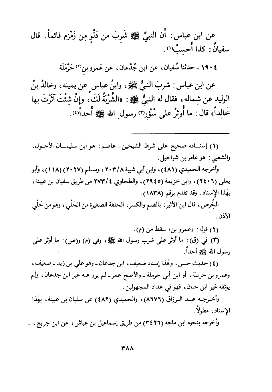 عَنِ ابْنِ عَبَّاسٍ، " أَنَّ النَّبِيَّ صَلَّى اللهُ عَلَيْهِ وَسَلَّمَ شَرِبَ مِنْ دَلْوٍ مِنْ زَمْزَمَ قَائِمًا " قَالَ سَفْيَانُ: كَذَا أَحْسَبُ (١)