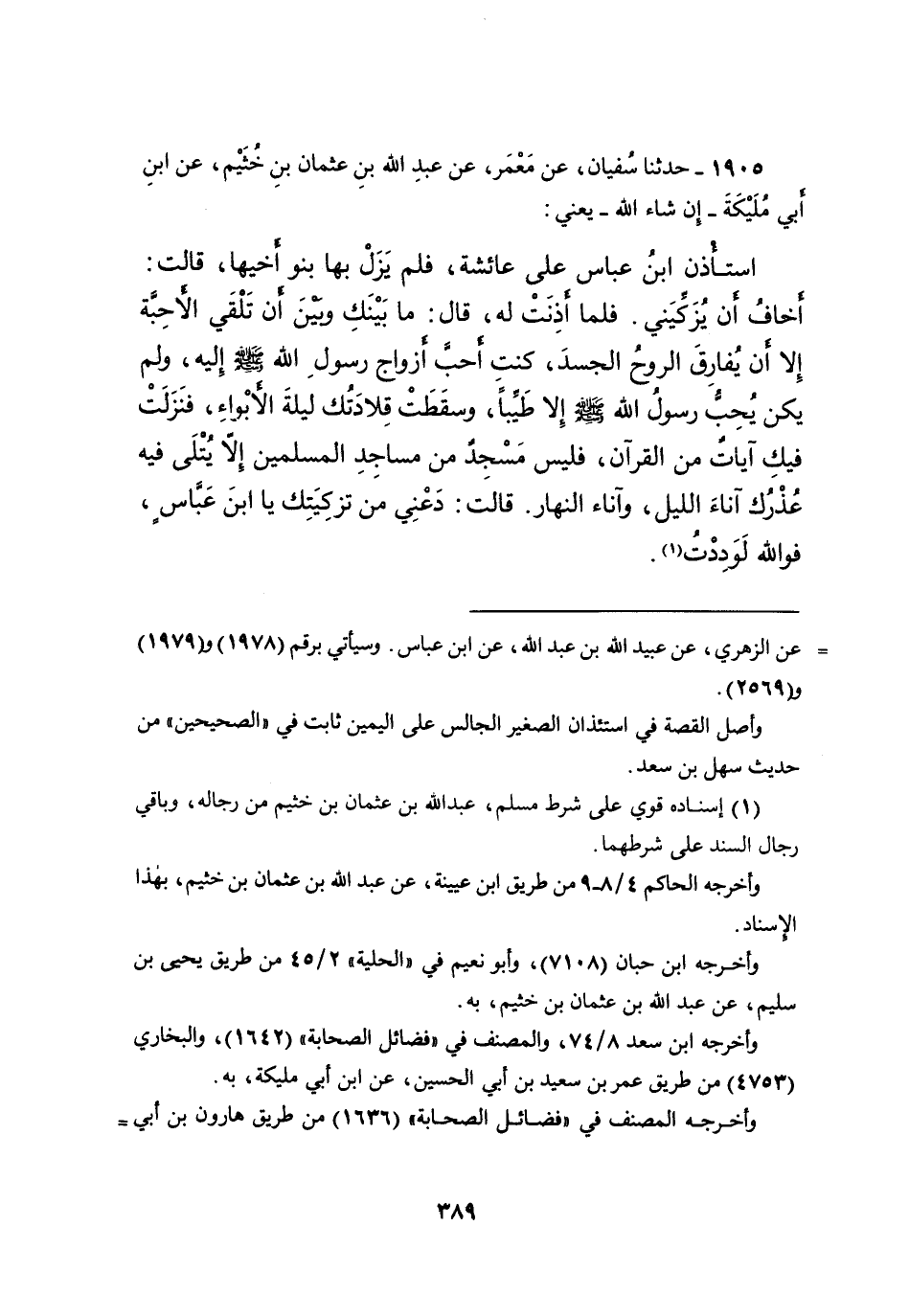 ١٩٠٥ - حَدَّثَنَا سُفْيَانُ، عَنْ مَعْمَرٍ، عَنْ عَبْدِ اللهِ بْنِ عُثْمَانَ بْنِ خُثَيْمٍ، عَنِ ابْنِ أَبِي مُلَيْكَةَ، إِنْ شَاءَ اللهُ يَعْنِي - اسْتَأْذَنَ ابْنُ عَبَّاسٍ عَلَى عَائِشَةَ، فَلَمْ يَزَلْ بِهَا بَنُو أَخِيهَا، قَالَتْ: أَخَافُ أَنْ يُزَكِّيَنِي، فَلَمَّا أَذِنَتْ لَهُ، قَالَ: " مَا بَيْنَكِ وَبَيْنَ أَنْ تَلْقَيِ الْأَحِبَّةَ إِلا أَنْ يُفَارِقَ الرُّوحُ الْجَسَدَ كُنْتِ أَحَبَّ أَزْوَاجِ رَسُولِ اللهِ صَلَّى اللهُ عَلَيْهِ وَسَلَّمَ إِلَيْهِ، وَلَمْ يَكُنْ يُحِبُّ رَسُولُ اللهِ صَلَّى اللهُ عَلَيْهِ وَسَلَّمَ إِلا طَيِّبًا، وَسَقَطَتْ قِلادَتُكِ لَيْلَةَ الْأَبْوَاءِ، فَنَزَلَتْ فِيكِ آيَاتٌ مِنَ القُرْآنِ، فَلَيْسَ مَسْجِدٌ مِنْ مَسَاجِدِ الْمُسْلِمِينَ إِلا يُتْلَى فِيهِ عُذْرُكِ آنَاءَ اللَّيْلِ، وَآنَاءَ النَّهَارِ " فَقَالَتْ: دَعْنِي مِنْ تَزْكِيَتِكَ يَا ابْنَ عَبَّاسٍ، فَوَاللهِ لَوَدِدْتُ (١)
