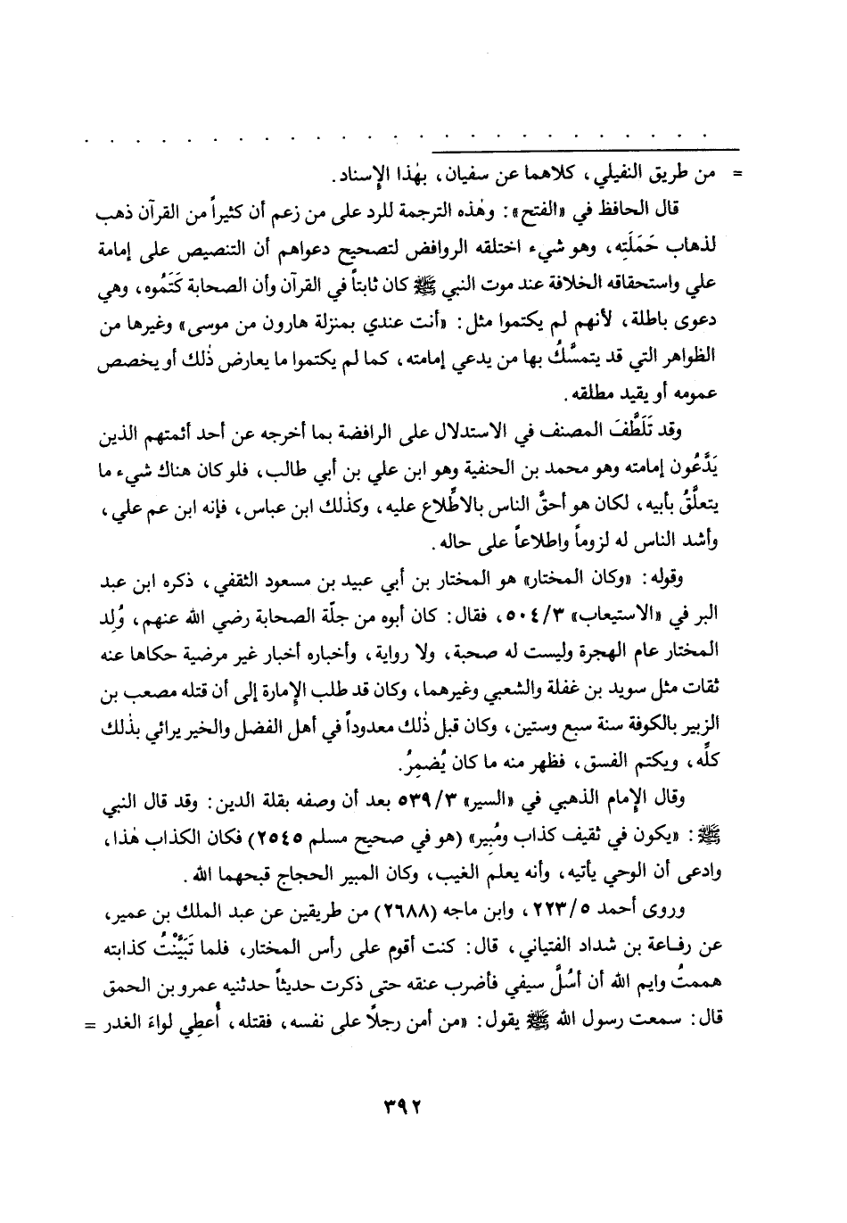 وقد تَلَطفَ المصنف في الاستدلال على الرافضة بما أخرجه عن أحد أئمتهم الذين يَدعون إمامته وهو محمد بن الحنفية وهو ابن علي بن أبي طالب، فلو كان هناك شيء ما يتعلقُ بأبيه، لكان هو أحق الناس بالاطلاع عليه، وكذلك ابن عباس، فإنه ابن عم علي، وأشد الناس له لزوماً واطلاعاً على حاله.