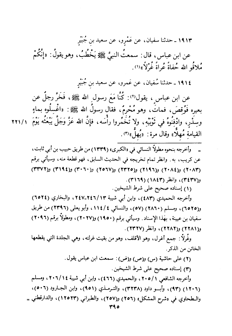 ١٩١٤ - حَدَّثَنَا سُفْيَانُ، عَنْ عَمْرٍو، عَنْ سَعِيدِ بْنِ جُبَيْرٍ، عَنِ ابْنِ عَبَّاسٍ، يَقُولُ (٢) : كُنَّا مَعَ رَسُولِ اللهِ صَلَّى اللهُ عَلَيْهِ وَسَلَّمَ، فَخَرَّ رَجُلٌ عَنْ بَعِيرِهِ، فَوُقِصَ فَمَاتَ وَهُوَ مُحْرِمٌ. فَقَالَ رَسُولُ اللهِ صَلَّى اللهُ عَلَيْهِ وَسَلَّمَ: " اغْسِلُوهُ بِمَاءٍ وَسِدْرٍ، وَادْفِنُوهُ فِي ثَوْبَيْهِ، وَلا تُخَمِّرُوا رَأْسَهُ، فَإِنَّ اللهَ عَزَّ وَجَلَّ يَبْعَثُهُ يَوْمَ الْقِيَامَةِ مُهِلًّا - وَقَالَ مَرَّةً: يُهِلُّ " (٣)