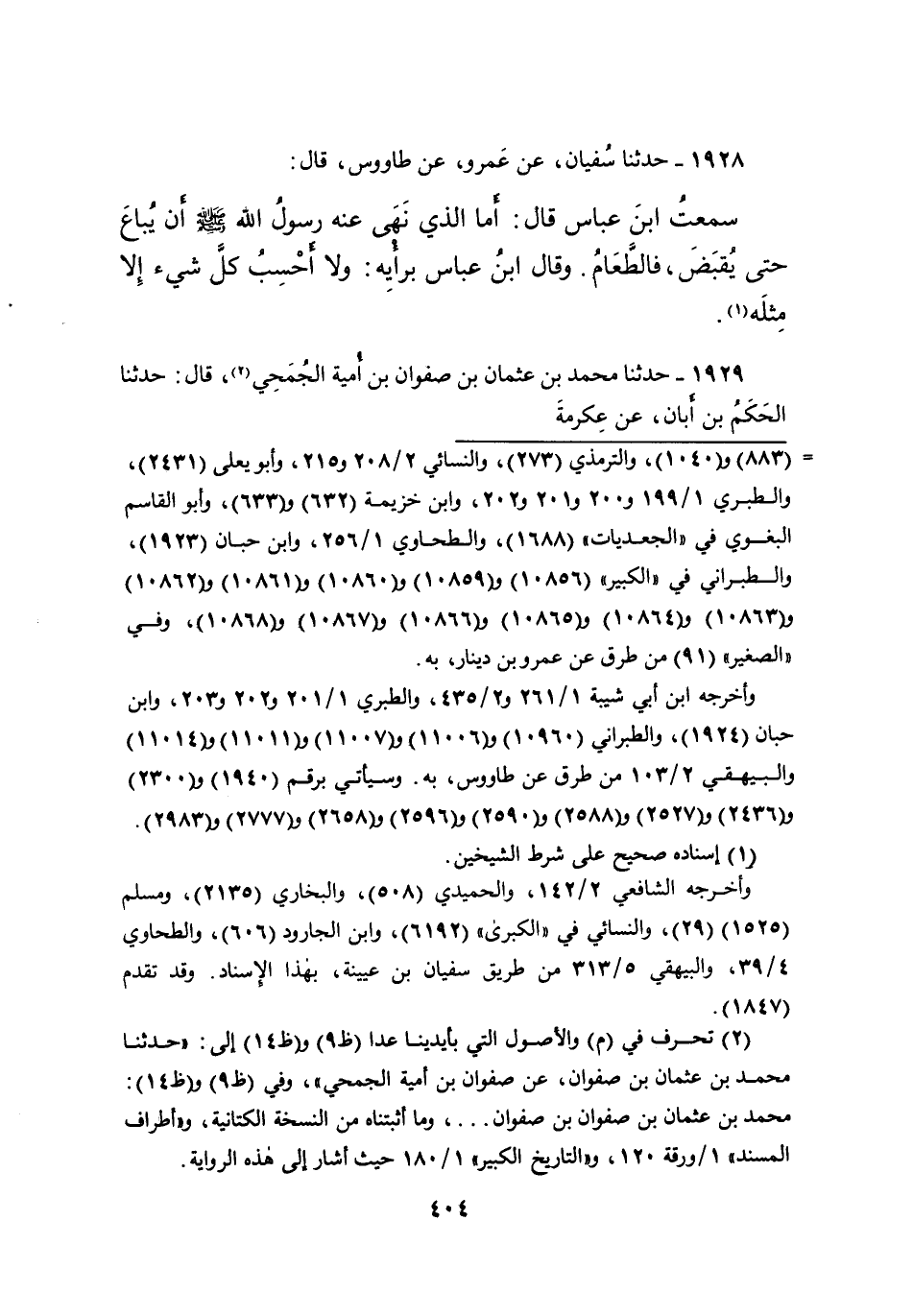 ١٩٢٨ - حَدَّثَنَا سُفْيَانُ، عَنْ عَمْرٍو، عَنْ طَاوُسٍ، قَالَ: سَمِعْتُ ابْنَ عَبَّاسٍ، قَالَ: " أَمَّا الَّذِي نَهَى عَنْهُ رَسُولُ اللهِ صَلَّى اللهُ عَلَيْهِ وَسَلَّمَ: أَنْ يُبَاعَ حَتَّى يُقْبَضَ فَالطَّعَامُ " وَقَالَ ابْنُ عَبَّاسٍ بِرَأْيِهِ: " وَلَا أَحْسَبُ كُلَّ شَيْءٍ إِلَّا مِثْلَهُ " (١)