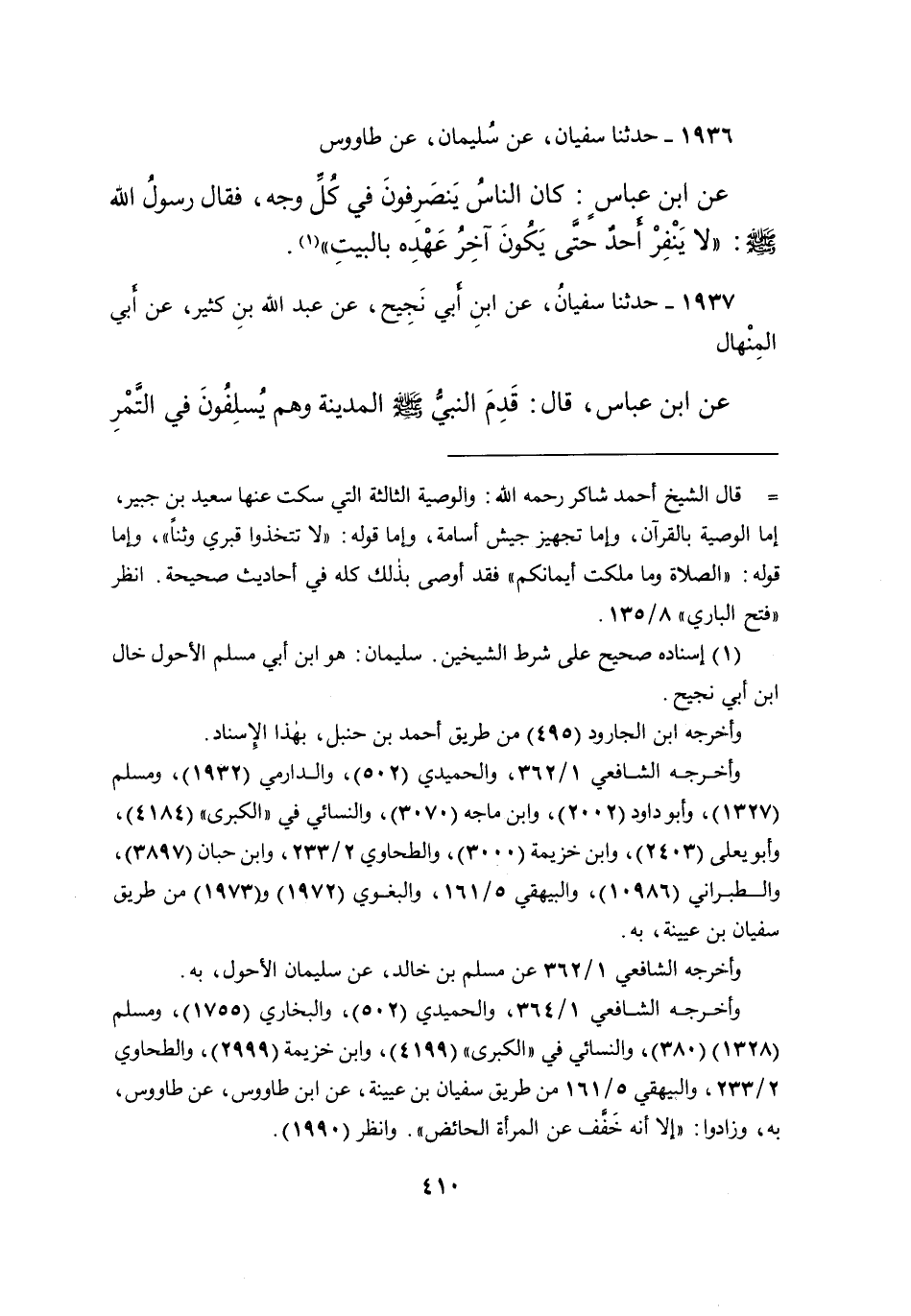 ١٩٣٦ - حَدَّثَنَا سُفْيَانُ، عَنْ سُلَيْمَانَ، عَنْ طَاوُسٍ، عَنِ ابْنِ عَبَّاسٍ، كَانَ النَّاسُ يَنْصَرِفُونَ فِي كُلِّ وَجْهٍ، فَقَالَ رَسُولُ اللهِ صَلَّى اللهُ عَلَيْهِ وَسَلَّمَ: " لَا يَنْفِرُ أَحَدٌ، حَتَّى يَكُونَ آخِرُ عَهْدِهِ بِالْبَيْتِ " (١)
