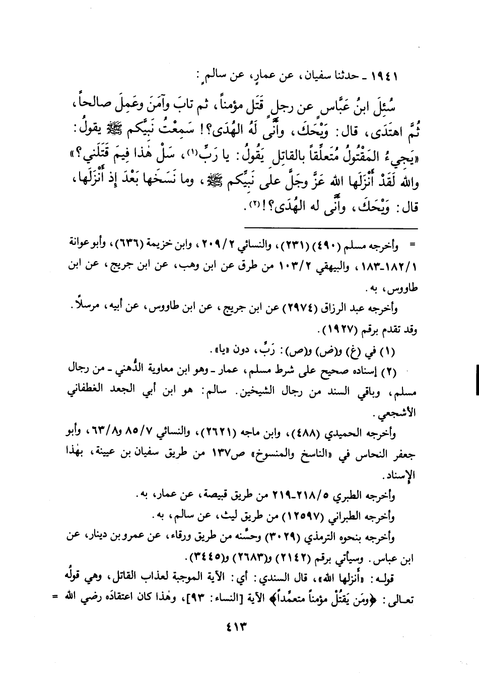 ١٩٤١ - حَدَّثَنَا سُفْيَانُ، عَنْ عَمَّارٍ، عَنْ سَالِمٍ، سُئِلَ ابْنُ عَبَّاسٍ عَنْ رَجُلٍ قَتَلَ مُؤْمِنًا، ثُمَّ تَابَ وَآمَنَ وَعَمِلَ صَالِحًا، ثُمَّ اهْتَدَى، قَالَ: وَيْحَكَ، وَأَنَّى لَهُ الْهُدَى، سَمِعْتُ نَبِيَّكُمْ صَلَّى اللهُ عَلَيْهِ وَسَلَّمَ، يَقُولُ: " يَجِيءُ الْمَقْتُولُ مُتَعَلِّقًا بِالْقَاتِلِ، يَقُولُ: يَا رَبِّ (١) ، سَلْ هَذَا فِيمَ قَتَلَنِي؟ " وَاللهِ لَقَدِ أَنْزَلَهَا اللهُ عَزَّ وَجَلَّ عَلَى نَبِيِّكُمْ صَلَّى اللهُ عَلَيْهِ وَسَلَّمَ، وَمَا نَسَخَهَا بَعْدَ إِذِ انْزَلَهَا، قَالَ: وَيْحَكَ، وَأَنَّى لَهُ الْهُدَى؟! (٢)