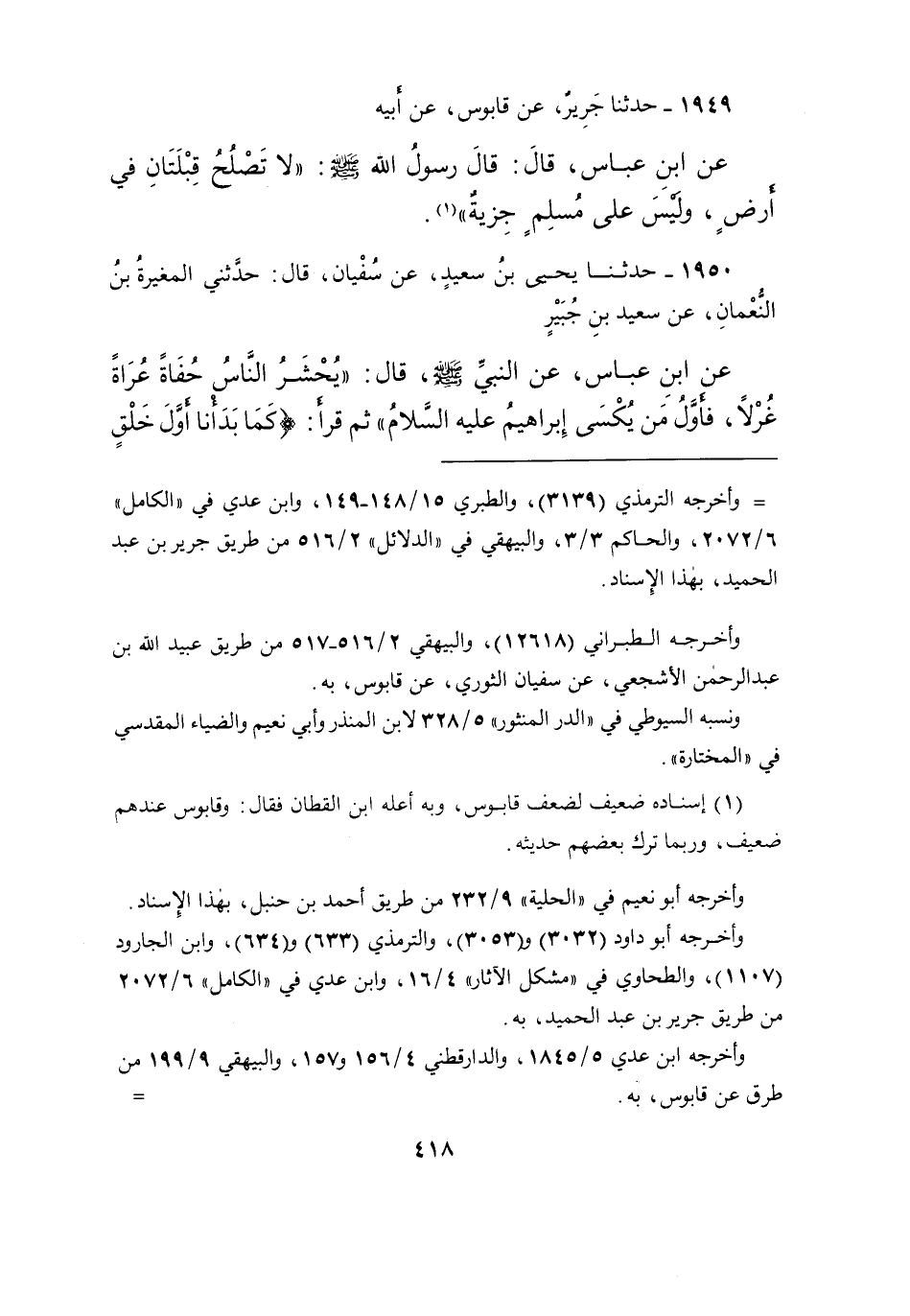 ١٩٤٩ - حَدَّثَنَا جَرِيرٌ، عَنْ قَابُوسَ، عَنْ أَبِيهِ، عَنِ ابْنِ عَبَّاسٍ، قَالَ: قَالَ رَسُولُ اللهِ صَلَّى اللهُ عَلَيْهِ وَسَلَّمَ: " لَا تَصْلُحُ قِبْلَتَانِ فِي أَرْضٍ، وَلَيْسَ عَلَى مُسْلِمٍ جِزْيَةٌ " (١)