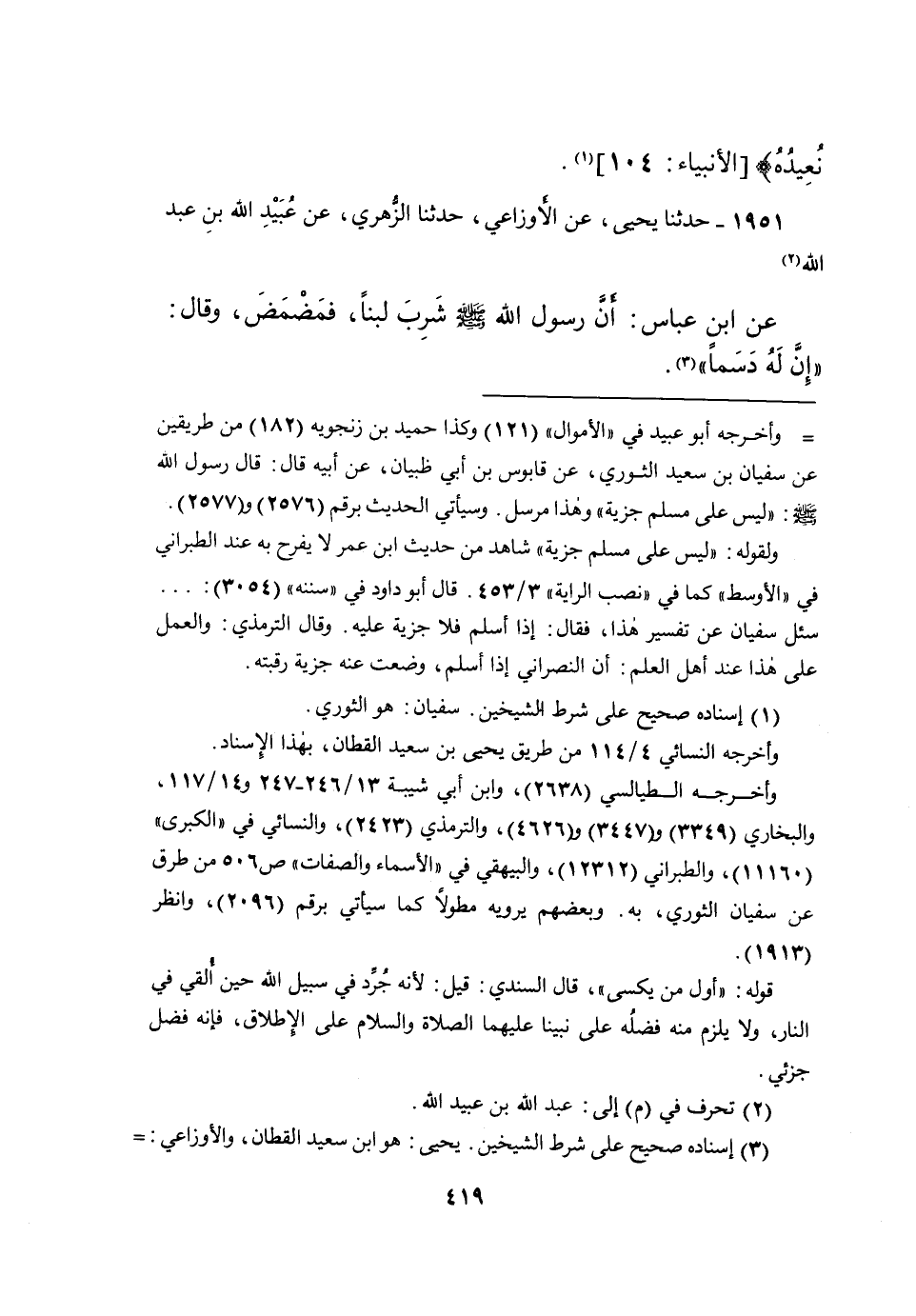 ١٩٥١ - حَدَّثَنَا يَحْيَى، عَنِ الْأَوْزَاعِيِّ، حَدَّثَنَا الزُّهْرِيُّ، عَنْ عُبَيْدِ اللهِ بْنِ عَبْدِ اللهِ (٢) ، عَنِ ابْنِ عَبَّاسٍ أَنَّ رَسُولَ اللهِ صَلَّى اللهُ عَلَيْهِ وَسَلَّمَ شَرِبَ لَبَنًا فَمَضْمَضَ، وَقَالَ: " إِنَّ لَهُ دَسَمًا " (٣)
