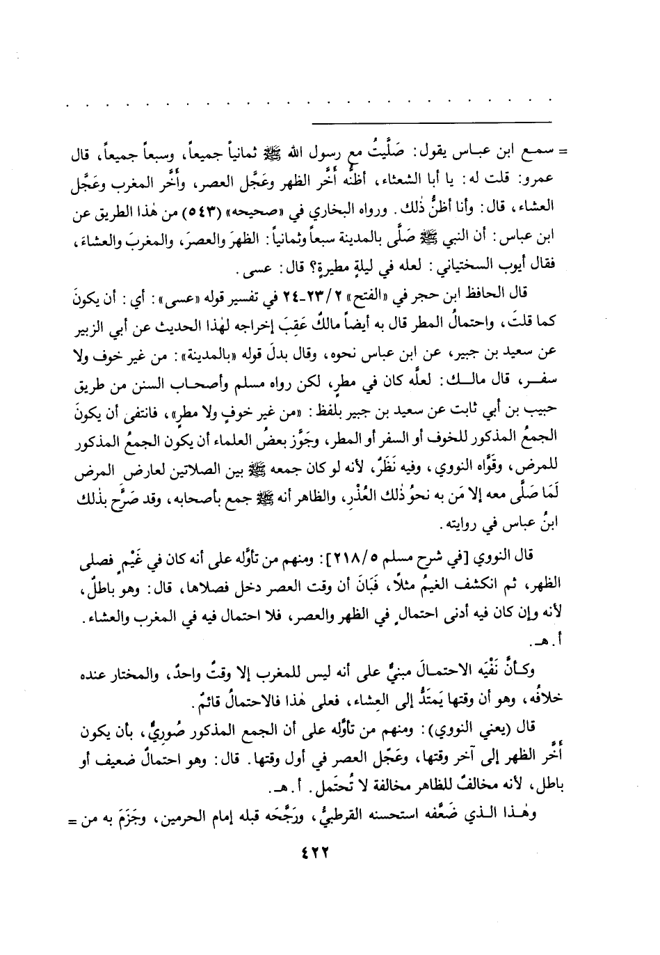 قال الحافظ ابن حجر في "الفتح" ٢/٢٣-٢٤ في تفسير قوله "عسى": أي: أن يكونَ كما قلتَ، واحتمالُ المطر قال به أيضاً مالك عَقِبَ إخراجه لهذا الحديث عن أبي الزبير عن سعيد بن جبير، عن ابن عباس نحوه، وقال بدلَ قوله "بالمدينة": من غير خوف ولا سفر، قال مالك: لعله كان في مطرٍ، لكن رواه مسلم وأصحاب السنن من طريق حبيب بن أبي ثابت عن سعيد بن جبير بلفظ: "من غير خوفٍ ولا مطرٍ"، فانتفى أن يكونَ الجمع المذكور للخوف أو السفر أو المطر، وجَوز بعضُ العلماء أن يكون الجمع المذكور للمرض، وقَواه النووي، وفيه نَظَر، لأنه لو كان جمعه صَلَّى اللهُ عَلَيْهِ وَسَلَّمَ بين الصلاتين لعارض المرض لَمَا صَلى معه إلا مَن به نحوُ ذلك العذْرِ، والظاهر أنه صَلَّى اللهُ عَلَيْهِ وَسَلَّمَ جمع بأصحابه، وقد صَرح بذلك ابن عباس في روايته.