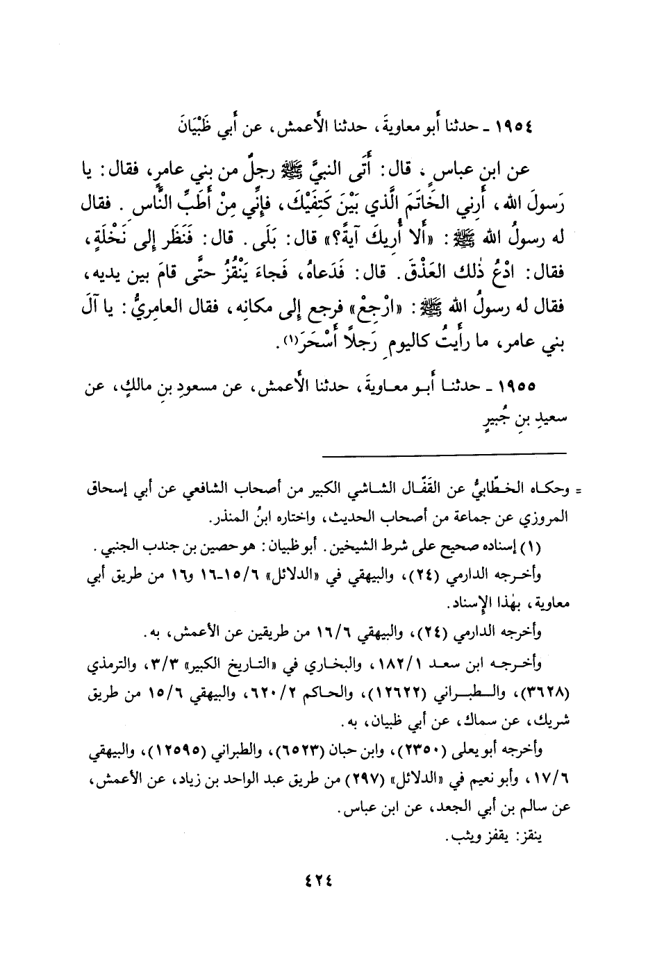 ١٩٥٤ - حَدَّثَنَا أَبُو مُعَاوِيَةَ، حَدَّثَنَا الْأَعْمَشُ، عَنْ أَبِي ظَبْيَانَ، عَنِ ابْنِ عَبَّاسٍ، قَالَ: أَتَى النَّبِيَّ صَلَّى اللهُ عَلَيْهِ وَسَلَّمَ رَجُلٌ مِنْ بَنِي عَامِرٍ، فَقَالَ: يَا رَسُولَ اللهِ، أَرِنِي الْخَاتَمَ الَّذِي بَيْنَ كَتِفَيْكَ، فَإِنِّي مِنْ أَطَبِّ النَّاسِ. فَقَالَ لَهُ رَسُولُ اللهِ صَلَّى اللهُ عَلَيْهِ وَسَلَّمَ: " أَلا أُرِيكَ آيَةً؟ " قَالَ: بَلَى، قَالَ: " فَنَظَرَ إِلَى نَخْلَةٍ "، فَقَالَ: " ادْعُ ذَلِكَ الْعِذْقَ "، قَالَ: فَدَعَاهُ، فَجَاءَ يَنْقُزُ، حَتَّى قَامَ بَيْنَ يَدَيْهِ، فَقَالَ لَهُ رَسُولُ اللهِ صَلَّى اللهُ عَلَيْهِ وَسَلَّمَ: " ارْجِعْ "، فَرَجَعَ إِلَى مَكَانِهِ، فَقَالَ الْعَامِرِيُّ: يَا آلَ بَنِي عَامِرٍ، مَا رَأَيْتُ كَالْيَوْمِ رَجُلًا أَسْحَرَ (١)
