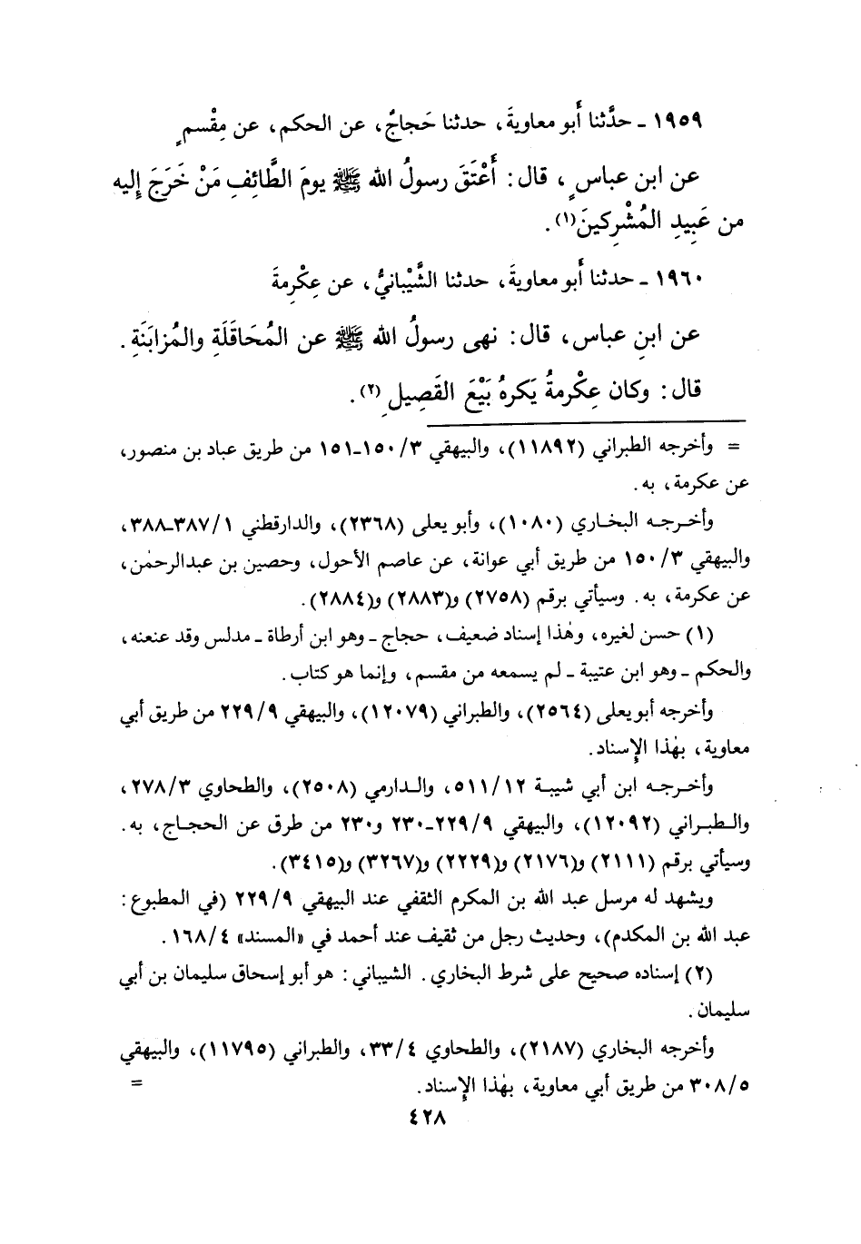 ١٩٥٩ - حَدَّثَنَا أَبُو مُعَاوِيَةَ، حَدَّثَنَا حَجَّاجٌ، عَنِ الْحَكَمِ، عَنْ مِقْسَمٍ، عَنِ ابْنِ عَبَّاسٍ، قَالَ: " أَعْتَقَ رَسُولُ اللهِ صَلَّى اللهُ عَلَيْهِ وَسَلَّمَ يَوْمَ الطَّائِفِ، مَنْ خَرَجَ إِلَيْهِ مِنْ عَبِيدِ الْمُشْرِكِينَ " (١)