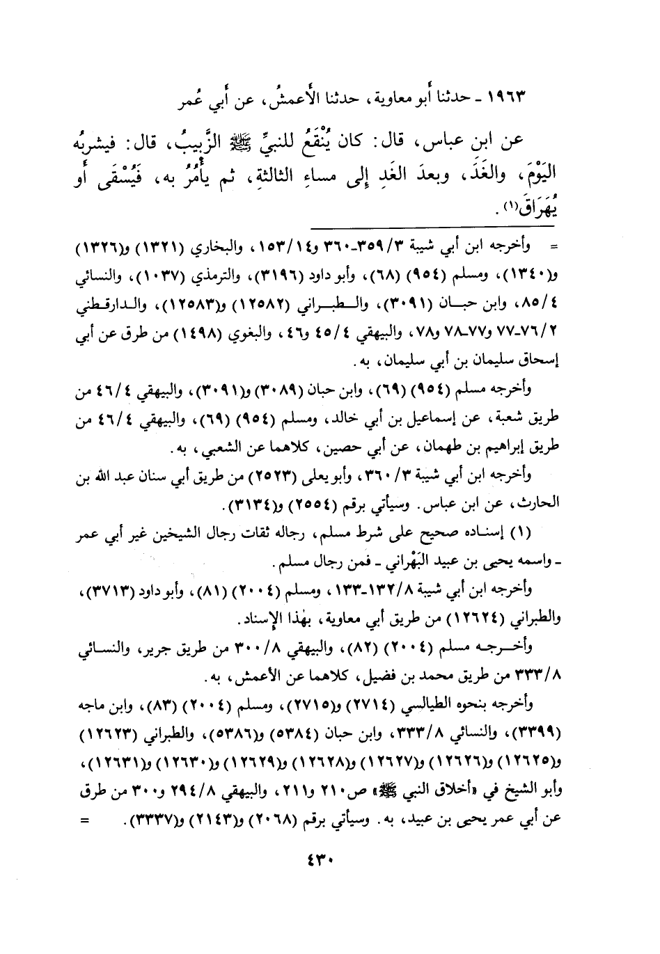 ١٩٦٣ - حَدَّثَنَا أَبُو مُعَاوِيَةَ، حَدَّثَنَا الْأَعْمَشُ، عَنْ أَبِي عُمَرَ، عَنِ ابْنِ عَبَّاسٍ، قَالَ: " كَانَ يُنْقَعُ لِلنَّبِيِّ صَلَّى اللهُ عَلَيْهِ وَسَلَّمَ الزَّبِيبُ " قَالَ: " فَيَشْرَبُهُ الْيَوْمَ وَالْغَدَ وَبَعْدَ الْغَدِ إِلَى مَسَاءِ الثَّالِثَةِ، ثُمَّ يُؤْمَرُ بِهِ فَيُسْقَى، أَوْ يُهَرَاقُ " (١)