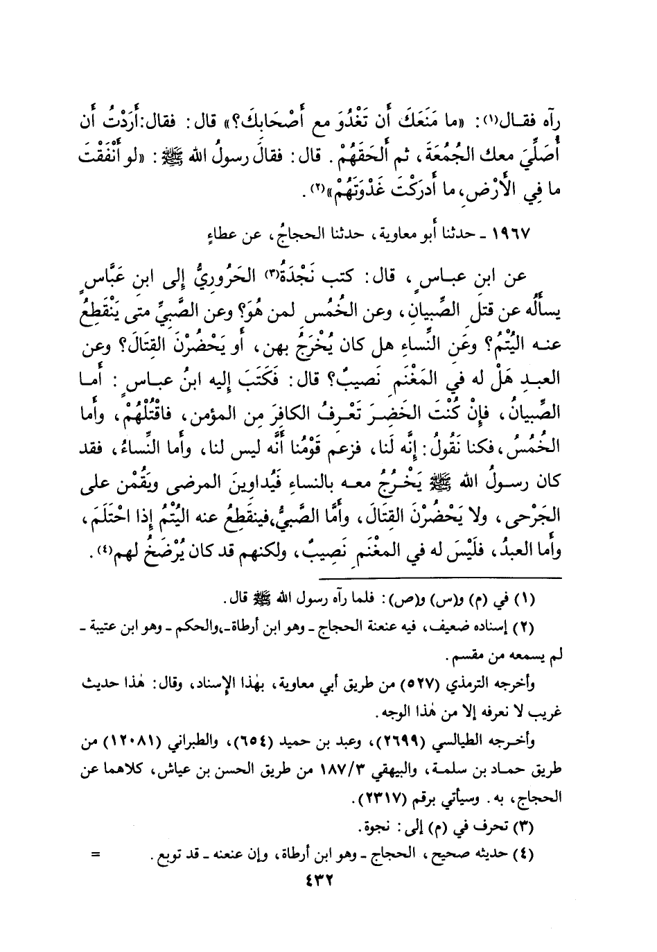 ١٩٦٧ - حَدَّثَنَا أَبُو مُعَاوِيَةَ، حَدَّثَنَا الْحَجَّاجُ، عَنْ عَطَاءٍ، عَنِ ابْنِ عَبَّاسٍ، قَالَ: " كَتَبَ نَجْدَةُ (٣) الْحَرُورِيُّ إِلَى ابْنِ عَبَّاسٍ يَسْأَلُهُ عَنْ قَتْلِ الصِّبْيَانِ، وَعَنِ الْخُمُسِ لِمَنْ هُوَ؟ وَعَنِ الصَّبِيِّ مَتَى يَنْقَطِعُ عَنْهُ الْيُتْمُ؟ وَعَنِ النِّسَاءِ، هَلْ كَانَ يَخْرُجُ بِهِنَّ، أَوْ يَحْضُرْنَ الْقِتَالَ؟ وَعَنِ الْعَبْدِ هَلْ لَهُ فِي الْمَغْنَمِ نَصِيبٌ؟ ". قَالَ: فَكَتَبَ إِلَيْهِ ابْنُ عَبَّاسٍ: " أَمَّا الصِّبْيَانُ: فَإِنْ كُنْتَ الْخَضِرَ تَعْرِفُ الْكَافِرَ مِنَ المُؤْمِنِ، فَاقْتُلْهُمْ. وَأَمَّا الْخُمُسُ: فَكُنَّا نَقُولُ إِنَّهُ لَنَا، فَزَعَمَ قَوْمُنَا أَنَّهُ لَيْسَ لَنَا. وَأَمَّا النِّسَاءُ فَقَدْ كَانَ رَسُولُ اللهِ صَلَّى اللهُ عَلَيْهِ وَسَلَّمَ يَخْرُجُ مَعَهُ بِالنِّسَاءِ فَيُدَاوِينَ الْمَرْضَى، وَيَقُمْنَ عَلَى الْجَرْحَى، وَلا يَحْضُرْنَ الْقِتَالَ، وَأَمَّا الصَّبِيُّ فَيَنْقَطِعُ عَنْهُ الْيُتْمُ إِذَا احْتَلَمَ، وَأَمَّا الْعَبْدُ فَلَيْسَ لَهُ مِنَ المَغْنَمِ نَصِيبٌ، وَلَكِنَّهُمْ قَدْ كَانَ يُرْضَخُ لَهُمْ " (٤)