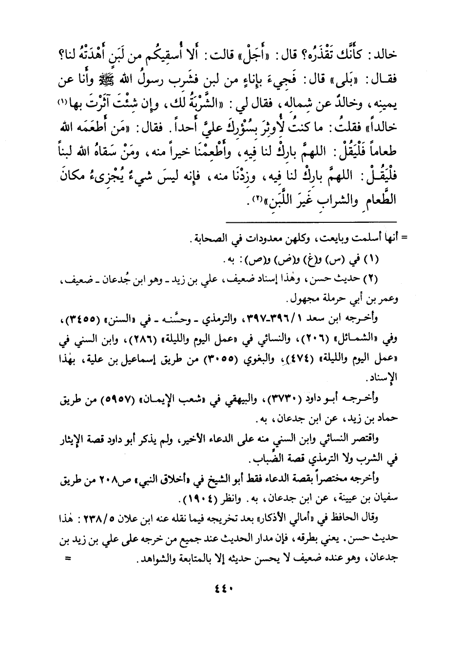 واقتصر النسائي وابن السني منه على الدعاء الأخير، ولم يذكر أبو داود قصة الإيثار في الشرب ولا الترمذي قصة الضّباب.