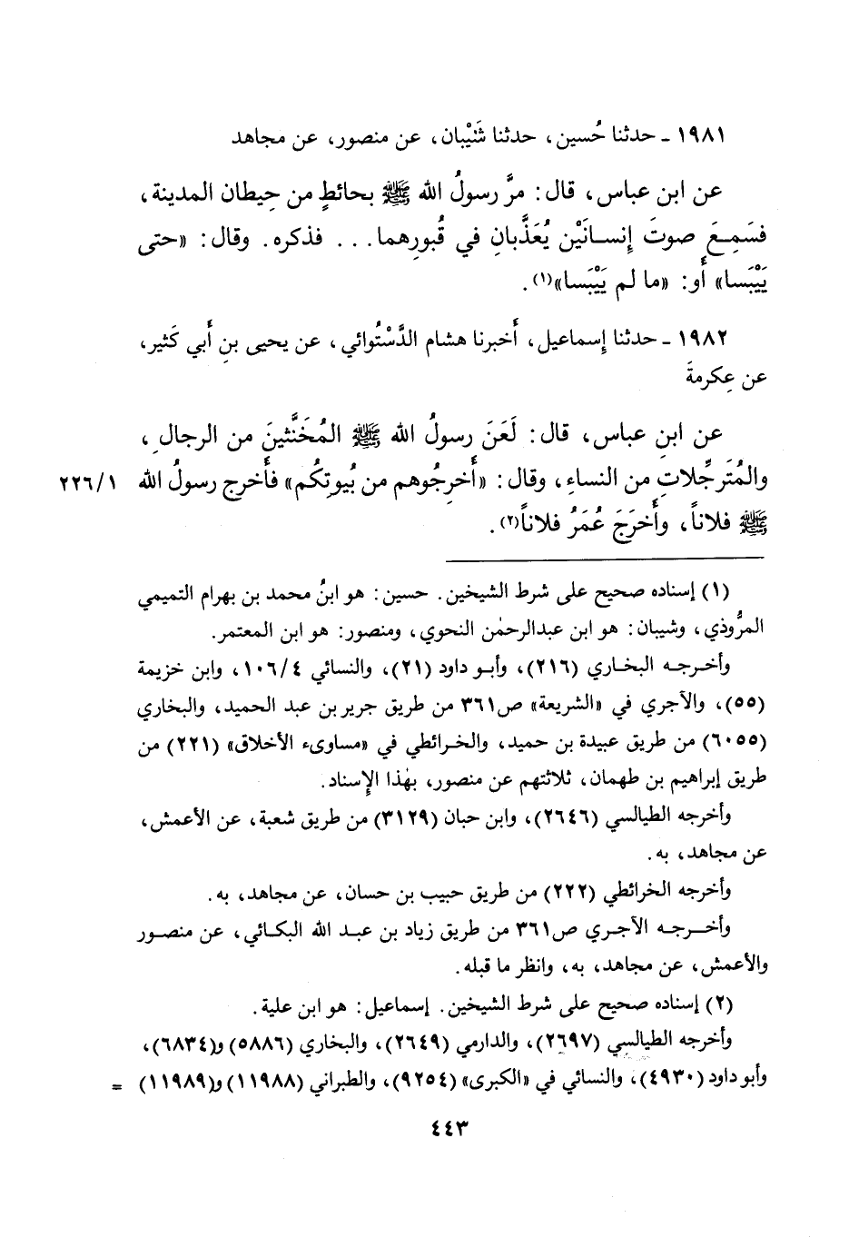 ١٩٨١ حَدَّثَنَا حُسَيْنٌ، حَدَّثَنَا شَيْبَانُ، عَنْ مَنْصُورٍ، عَنْ مُجَاهِدٍ، عَنِ ابْنِ عَبَّاسٍ، قَالَ: مَرَّ رَسُولُ اللهِ صَلَّى اللهُ عَلَيْهِ وَسَلَّمَ، بِحَائِطٍ مِنْ حِيطَانِ الْمَدِينَةِ، فَسَمِعَ صَوْتَ إِنْسَانَيْنِ يُعَذَّبَانِ فِي قَبْرِهِمَا، فَذَكَرَهُ، وَقَالَ: " حَتَّى يَيْبَسَا، أَوْ: مَا لَمْ يَيْبَسَا " (١)