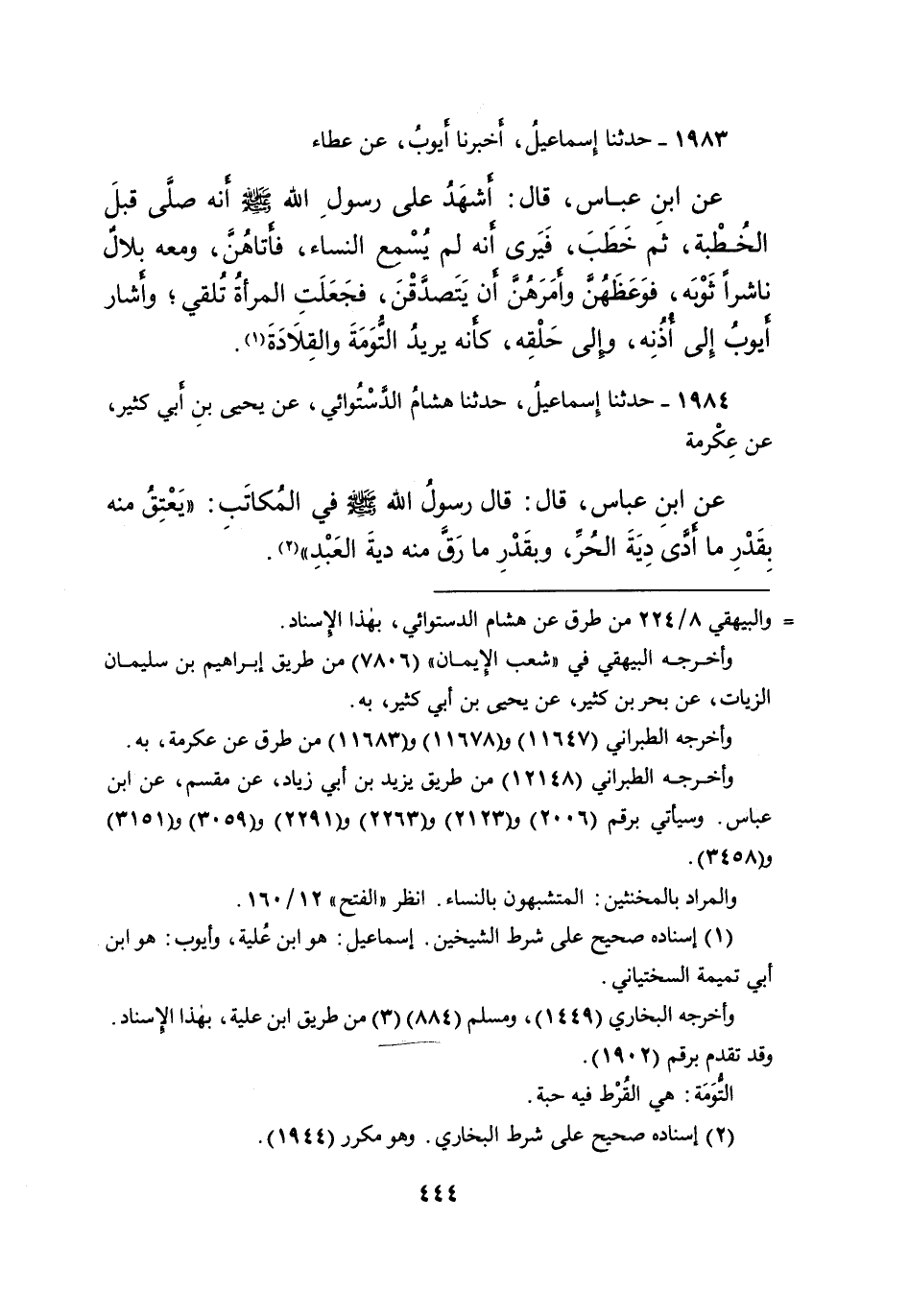١٩٨٣ - حَدَّثَنَا إِسْمَاعِيلُ، أَخْبَرَنَا أَيُّوبُ، عَنْ عَطَاءٍ، عَنِ ابْنِ عَبَّاسٍ، قَالَ: " أَشْهَدُ عَلَى رَسُولِ اللهِ صَلَّى اللهُ عَلَيْهِ وَسَلَّمَ، أَنَّهُ صَلَّى قَبْلَ الْخُطْبَةِ، ثُمَّ خَطَبَ، فَيَرَى أَنَّهُ لَمْ يُسْمِعِ النِّسَاءَ، فَأَتَاهُنَّ وَمَعَهُ بِلالٌ نَاشِرًا ثَوْبَهُ، فَوَعَظَهُنَّ، وَأَمَرَهُنَّ أَنْ يَتَصَدَّقْنَ، فَجَعَلَتِ الْمَرْأَةُ تُلْقِي "، وَأَشَارَ أَيُّوبُ إِلَى أُذُنِهِ وَإِلَى حَلْقِهِ، كَأَنَّهُ يُرِيدُ التُّومَةَ، وَالْقِلادَةَ (١)