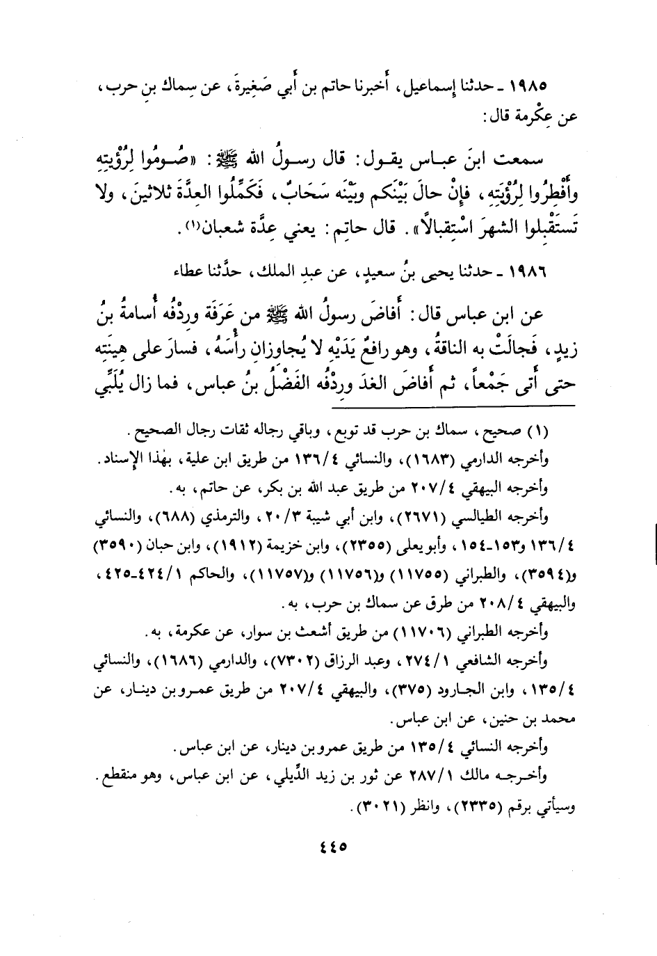 ١٩٨٥ - حَدَّثَنَا إِسْمَاعِيلُ، أَخْبَرَنَا حَاتِمُ بْنُ أَبِي صَغِيرَةَ، عَنْ سِمَاكِ بْنِ حَرْبٍ، عَنْ عِكْرِمَةَ، قَالَ: سَمِعْتُ ابْنَ عَبَّاسٍ، يَقُولُ: قَالَ رَسُولُ اللهِ صَلَّى اللهُ عَلَيْهِ وَسَلَّمَ: " صُومُوا لِرُؤْيَتِهِ، وَأَفْطِرُوا لِرُؤْيَتِهِ، فَإِنْ حَالَ بَيْنَكُمْ وَبَيْنَهُ سَحَابٌ فَكَمِّلُوا الْعِدَّةَ ثَلاثِينَ، وَلا تَسْتَقْبِلُوا الشَّهْرَ اسْتِقْبَالًا " قَالَ حَاتِمٌ: يَعْنِي عِدَّةَ شَعْبَانَ (١)