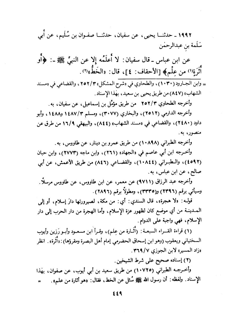 ١٩٩٢ - حَدَّثَنَا يَحْيَى، عَنْ سُفْيَانَ، حَدَّثَنَا صَفْوَانُ بْنُ سُلَيْمٍ، عَنْ أَبِي سَلَمَةَ بْنِ عَبْدِ الرَّحْمَنِ، عَنِ ابْنِ عَبَّاسٍ، قَالَ سُفْيَانُ: لَا أَعْلَمُهُ إِلا عَنِ النَّبِيِّ صَلَّى اللهُ عَلَيْهِ وَسَلَّمَ: {أَوْ أَثَرَةٍ (١) مِنْ عِلْمٍ} [الأحقاف: ٤] ، قَالَ: " الْخَطُّ " (٢)