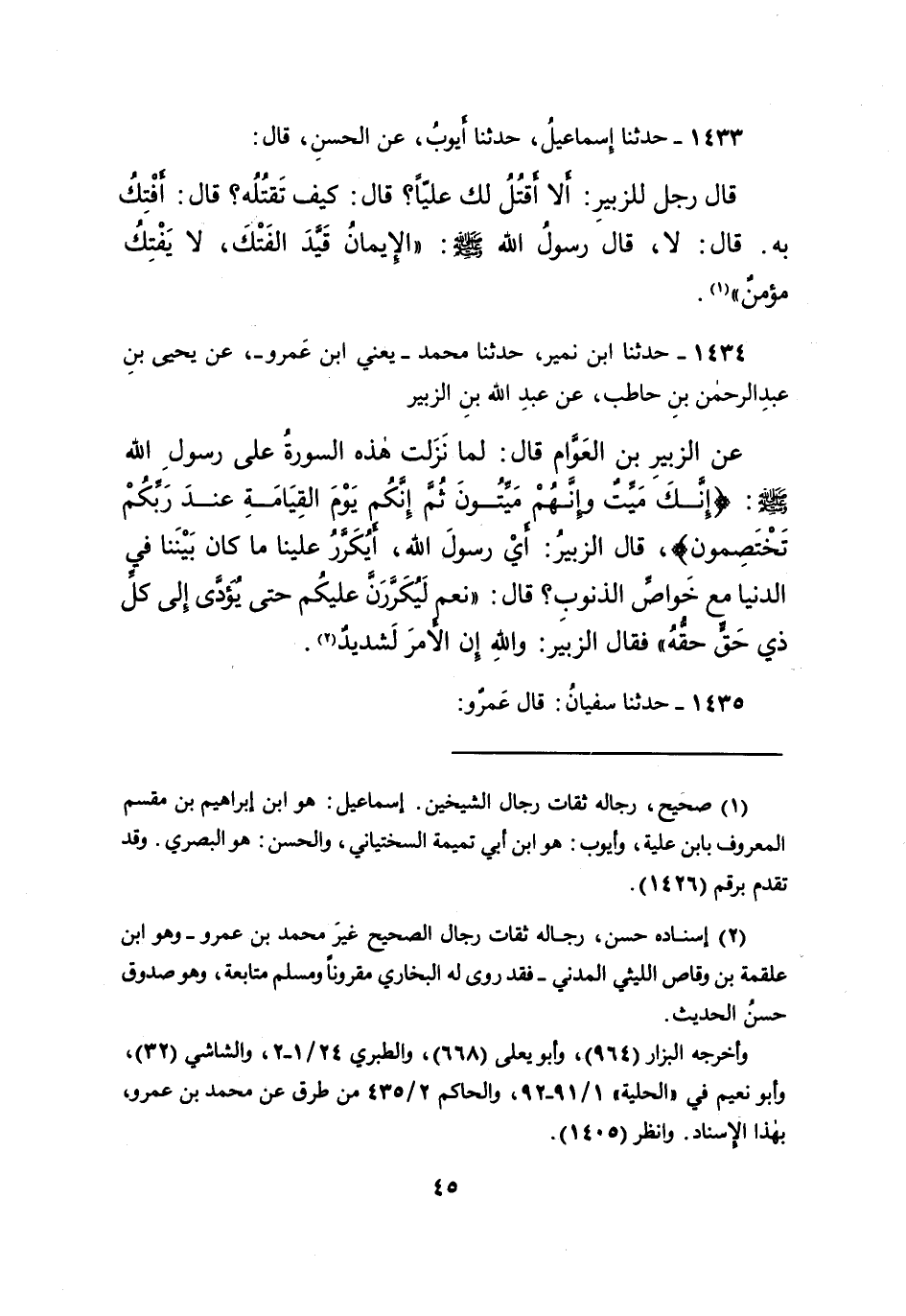 ١٤٣٤ - حَدَّثَنَا ابْنُ نُمَيْرٍ، حَدَّثَنَا مُحَمَّدٌ يَعْنِي ابْنَ عَمْرٍو، عَنْ يَحْيَى بْنِ عَبْدِ الرَّحْمَنِ بْنِ حَاطِبٍ، عَنْ عَبْدِ اللهِ بْنِ الزُّبَيْرِ، عَنِ الزُّبَيْرِ بْنِ الْعَوَّامِ، قَالَ: لَمَّا نَزَلَتْ هَذِهِ السُّورَةُ عَلَى رَسُولِ اللهِ صَلَّى اللهُ عَلَيْهِ وَسَلَّمَ: {إِنَّكَ مَيِّتٌ وَإِنَّهُمْ مَيِّتُونَ ثُمَّ إِنَّكُمْ يَوْمَ الْقِيَامَةِ عِنْدَ رَبِّكُمْ تَخْتَصِمُونَ} قَالَ الزُّبَيْرُ: أَيْ رَسُولَ اللهِ أَيُكَرَّرُ عَلَيْنَا مَا كَانَ بَيْنَنَا فِي الدُّنْيَا مَعَ خَوَاصِّ الذُّنُوبِ؟ قَالَ: " نَعَمْ لَيُكَرَّرَنَّ عَلَيْكُمْ حَتَّى يُؤَدَّى إِلَى كُلِّ ذِي حَقٍّ حَقُّهُ " فَقَالَ الزُّبَيْرُ: وَاللهِ إِنَّ الْأَمْرَ لَشَدِيدٌ (٢)