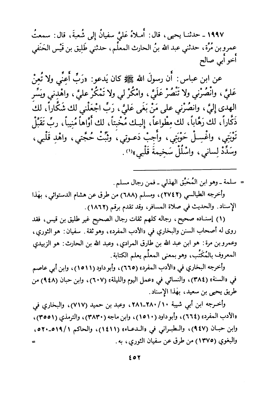 ١٩٩٧ - حَدَّثَنَا يَحْيَى، قَالَ: أَمْلاهُ عَلَيَّ سُفْيَانُ، إِلَى شُعْبَةَ، قَالَ: سَمِعْتُ عَمْرَو بْنَ مُرَّةَ، حَدَّثَنِي عَبْدُ اللهِ بْنُ الْحَارِثِ الْمُعَلِّمُ، حَدَّثَنِي طَلِيقُ بْنُ قَيْسٍ الْحَنَفِيُّ أَخُو أَبِي صَالِحٍ، عَنِ ابْنِ عَبَّاسٍ: أَنَّ رَسُولَ اللهِ صَلَّى اللهُ عَلَيْهِ وَسَلَّمَ كَانَ يَدْعُو: " رَبِّ أَعِنِّي وَلا تُعِنْ عَلَيَّ، وَانْصُرْنِي وَلا تَنْصُرْ عَلَيَّ، وَامْكُرْ لِي وَلا تَمْكُرْ عَلَيَّ، وَاهْدِنِي وَيَسِّرِ الْهُدَى إِلَيَّ، وَانْصُرْنِي عَلَى مَنْ بَغَى عَلَيَّ، رَبِّ اجْعَلْنِي لَكَ شَكَّارًا، لَكَ ذَكَّارًا، لَكَ رَهَّابًا، لَكَ مِطْوَاعًا، إِلَيْكَ مُخْبِتًا، لَكَ أَوَّاهًا مُنِيبًا، رَبِّ تَقَبَّلْ تَوْبَتِي، وَاغْسِلْ حَوْبَتِي، وَأَجِبْ دَعْوَتِي، وَثَبِّتْ حُجَّتِي، وَاهْدِ قَلْبِي وَسَدِّدْ لِسَانِي، وَاسْلُلْ سَخِيمَةَ قَلْبِي " (١)