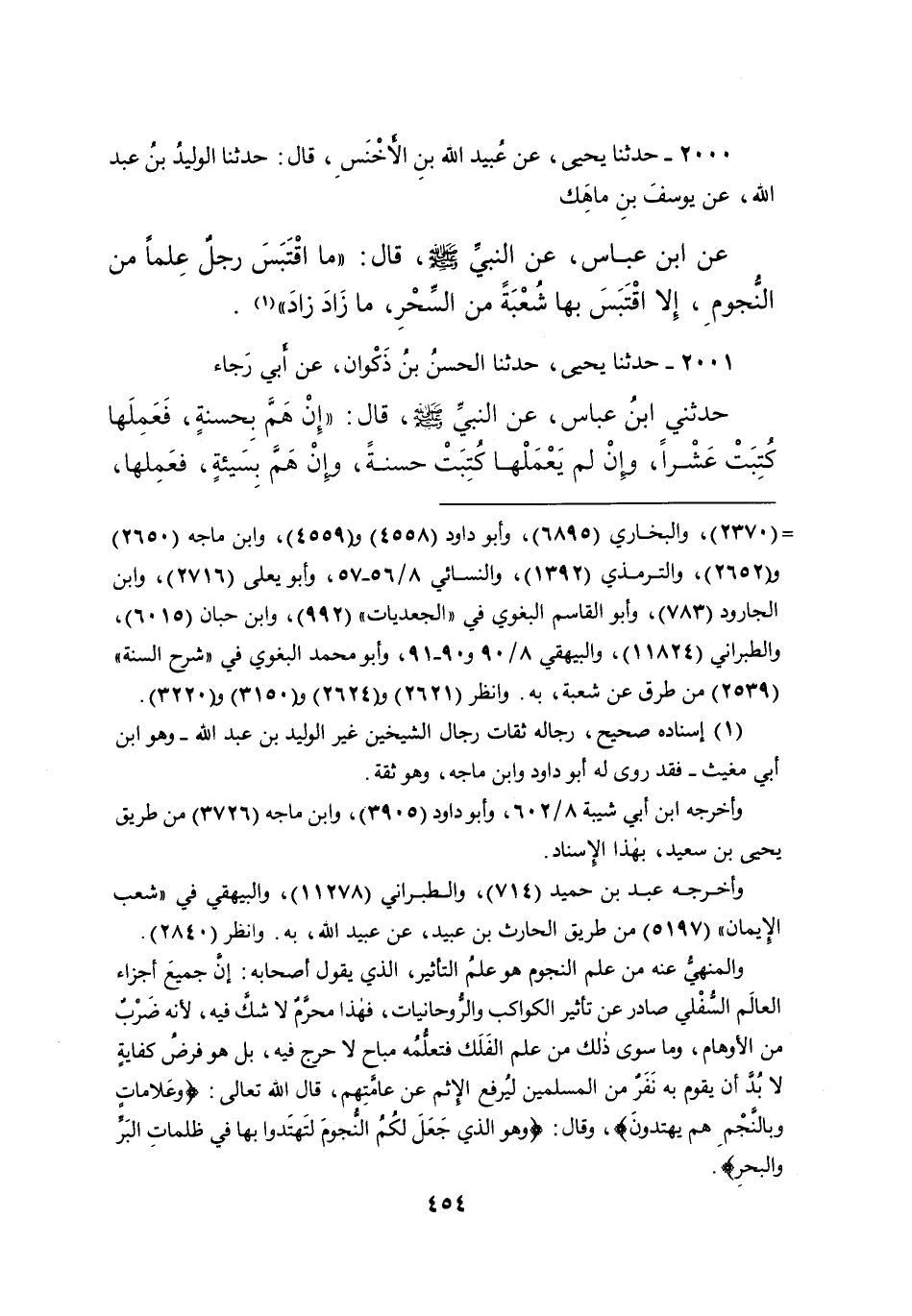 ٢٠٠٠ - حَدَّثَنَا يَحْيَى، عَنْ عُبَيْدِ اللهِ بْنِ الْأَخْنَسِ، قَالَ: حَدَّثَنَا الْوَلِيدُ بْنُ عَبْدِ اللهِ، عَنْ يُوسُفَ بْنِ مَاهَكَ، عَنِ ابْنِ عَبَّاسٍ، عَنِ النَّبِيِّ صَلَّى اللهُ عَلَيْهِ وَسَلَّمَ قَالَ: " مَا اقْتَبَسَ رَجُلٌ عِلْمًا مِنَ النُّجُومِ، إِلا اقْتَبَسَ بِهَا شُعْبَةً مِنَ السِّحْرِ، مَا زَادَ زَادَ " (١)